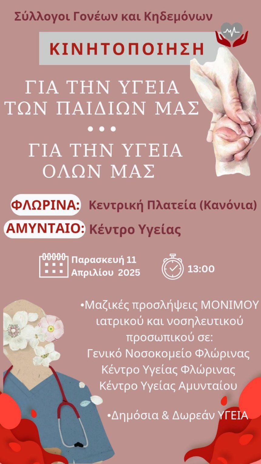 Φλώρινα: Παρασκευή 11 Απριλίου 2025, ώρα 13:00 στην Κεντρική πλατεία (κανόνια). Θα ακολουθήσει πορεία προς το Κέντρο Υγείας Φλώρινας που θα καταλήξει στο Γενικό Νοσοκομείο Φλώρινας.