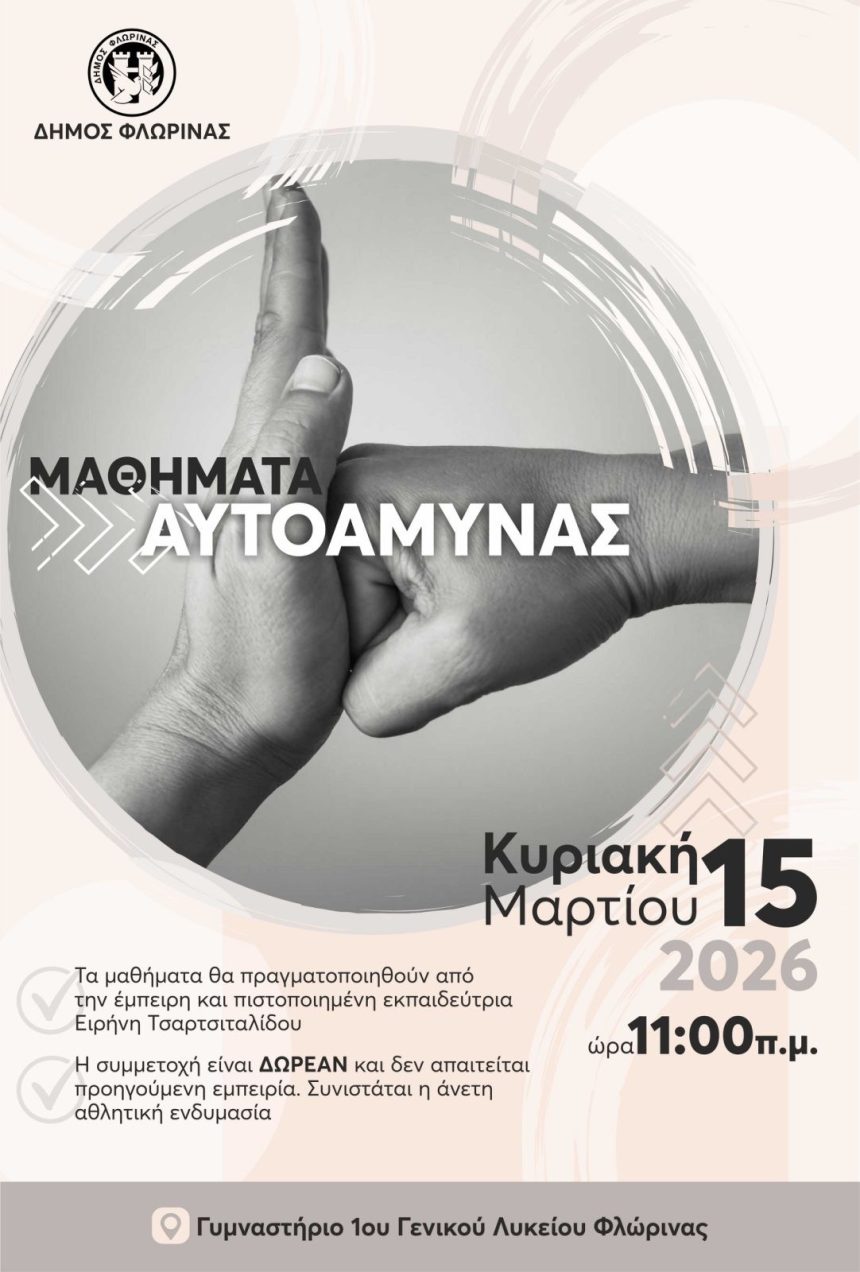 Ο Δήμος Φλώρινας, στο πλαίσιο των δράσεών του για την προαγωγή της ασφάλειας, της άθλησης και της ευεξίας των πολιτών, διοργανώνει μαθήματα αυτοάμυνας την Κυριακή 15 Μαρτίου 2026, στις 11:00 π.μ., στο γυμναστήριο του 1ου Γενικού Λυκείου Φλώρινας.