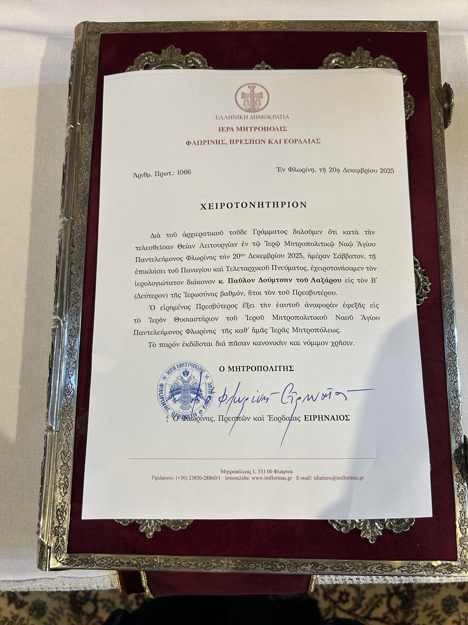 Το Σάββατο 20 Δεκεμβρίου 2025, στον Ιερό Μητροπολιτικό Ναό Αγίου Παντελεήμονος Φλώρινας, τελέστηκε η Αρχιερατική Θεία Λειτουργία ιερουργούντος  του Σεβασμιωτάτου Μητροπολίτου Φλωρίνης, Πρεσπών και Εορδαίας κ. Ειρηναίου. Κατά τη διάρκεια της Θείας Λειτουργίας τελέστηκε η εις Πρεσβύτερον Χειροτονία του Διακόνου της Ιεράς Μητροπόλεώς μας, π. Παύλου Δούμτση, εγγάμου κληρικού και πατρός ενός τέκνου.