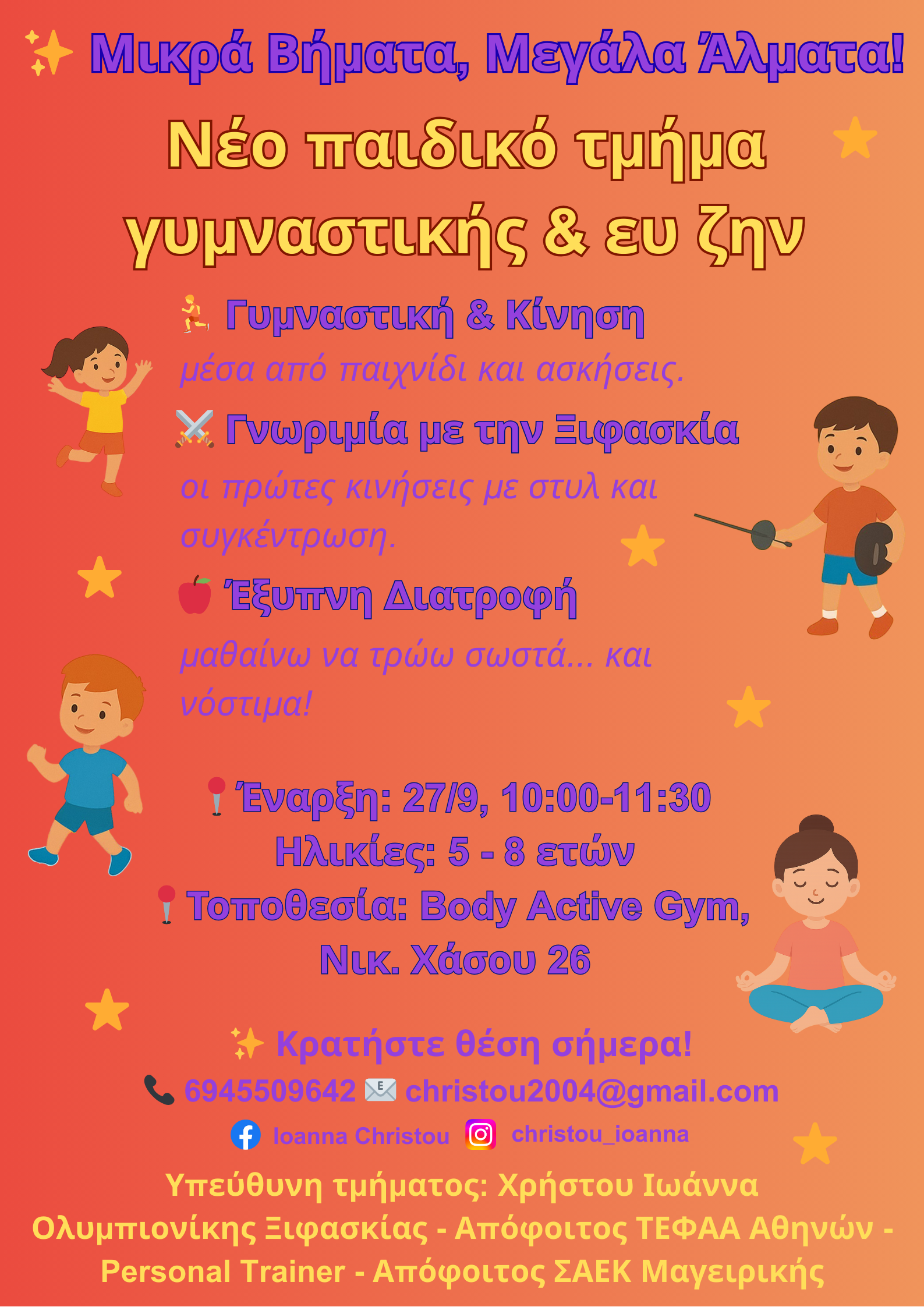 «Μέσα από μικρά βήματα μπορούμε να πετύχουμε μεγάλα άλματα. Στόχος μας είναι τα παιδιά να αγαπήσουν την κίνηση, τον αθλητισμό και τις υγιεινές συνήθειες, πάντα με χαρά και δημιουργικότητα. Σας περιμένουμε με πολλή αγάπη!».