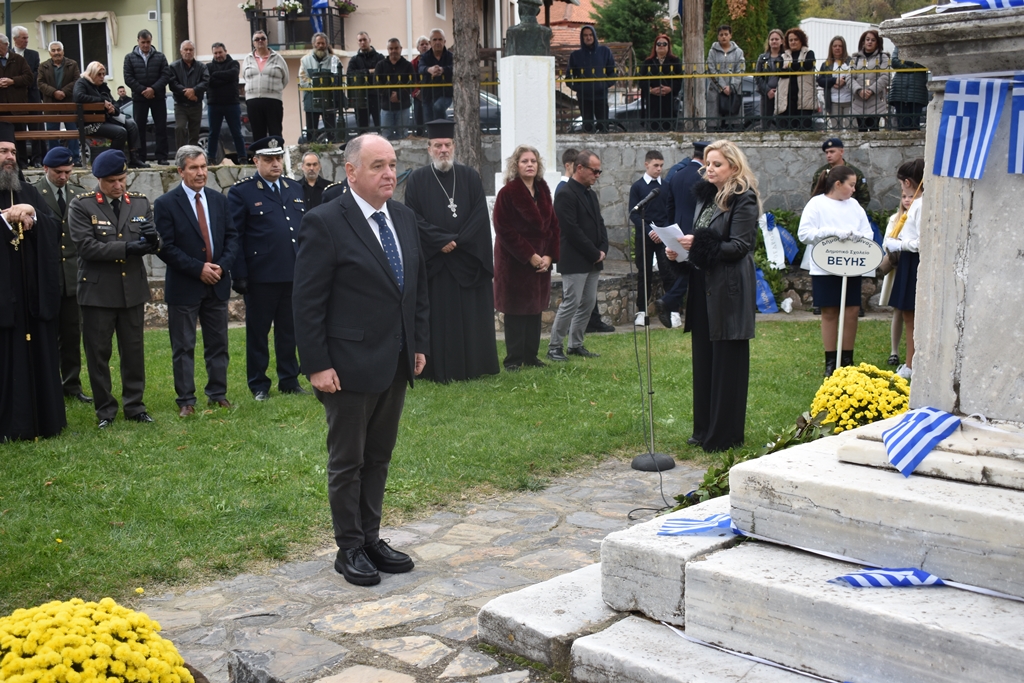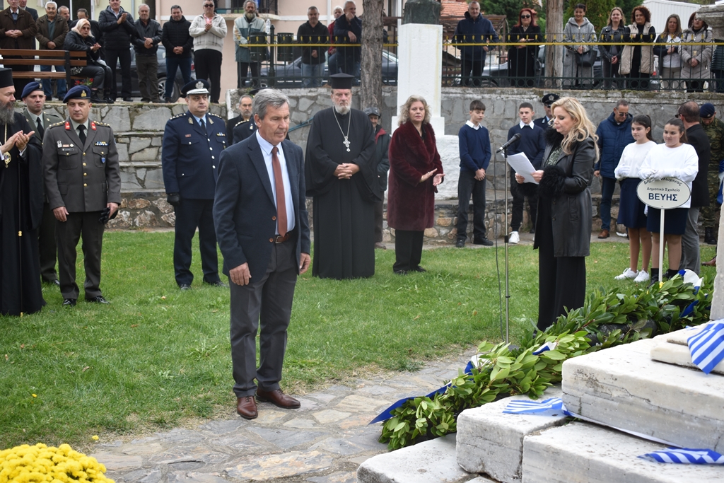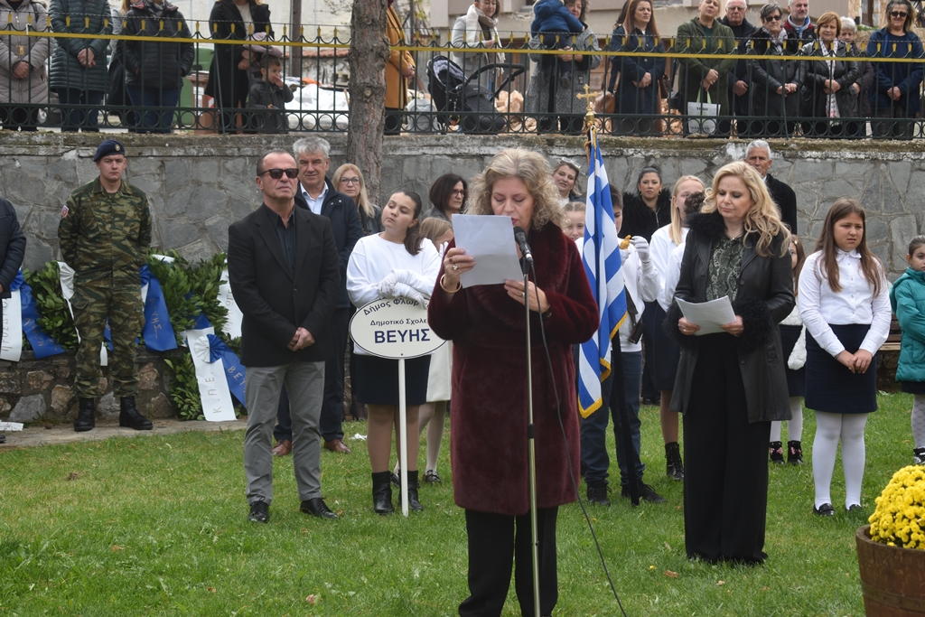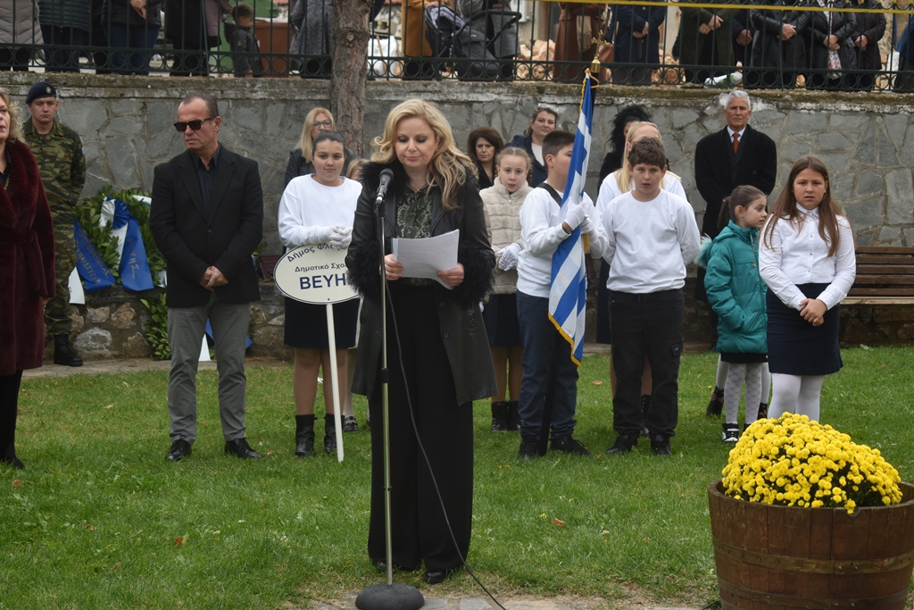 Οι εκδηλώσεις ξεκίνησαν με επιμνημόσυνη δέηση στον χώρο του Ηρώου της κοινότητας και ακολούθησε ομιλία για το ιστορικό της επετείου από την φιλόλογο – διευθύντρια του Γυμνασίου Βεύης κα Βασιλική Μούζα, προσκλητήριο πεσόντων κατοίκων της Βεύης, κατάθεση στεφάνων και η ανάκρουση του εθνικού ύμνου από την Φιλαρμονική του Δήμου Φλώρινας.