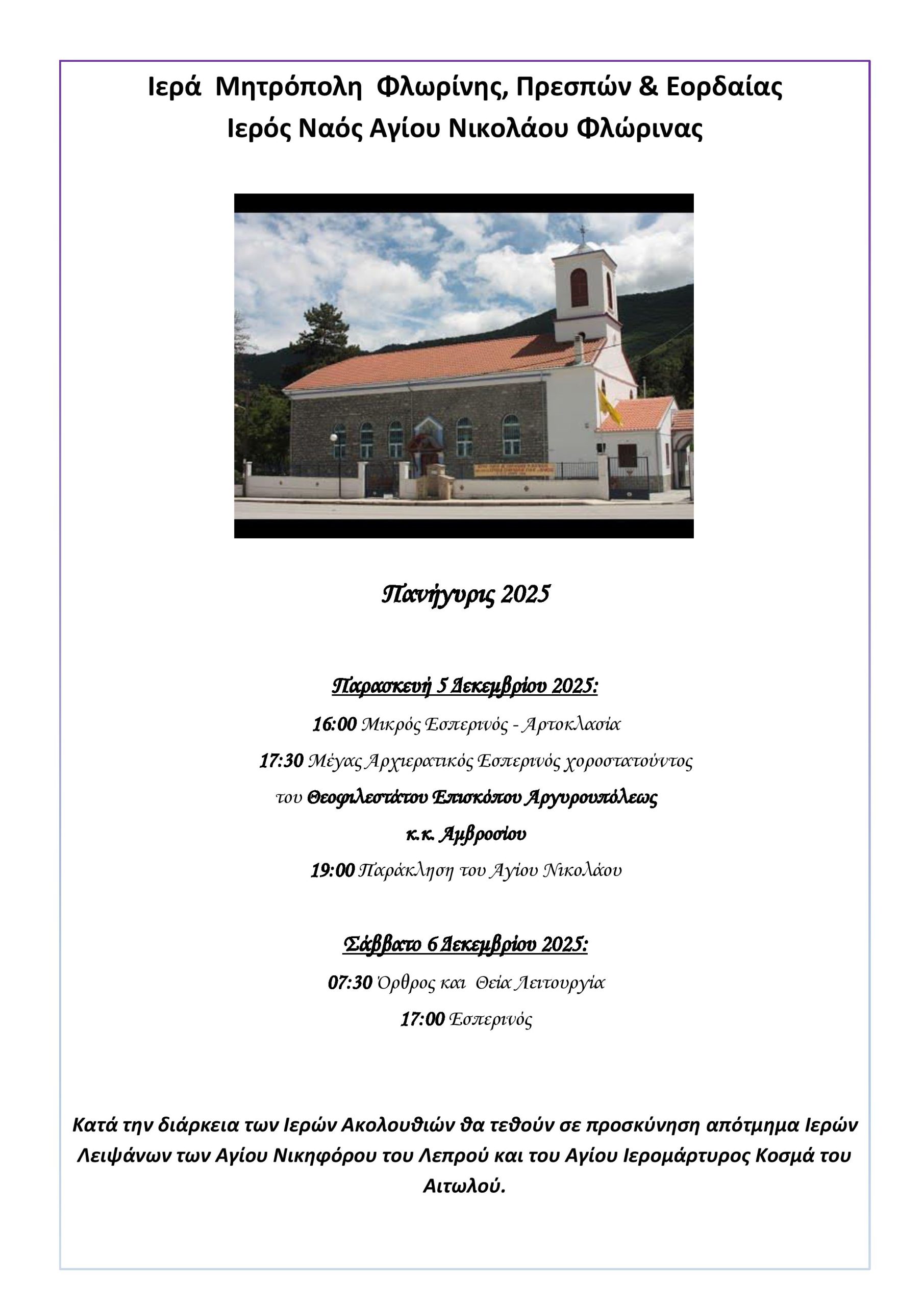 ΚοινωνίαΠανήγυρις Ιερού Ναού Αγίου Νικολάου Φλώρινας Τρίτη 2 Δεκεμβρίου, 2025 21:13 florinapress.gr SHARE Ίσως να ενδιαφέρει ... Επισκέψεις του νέου Διοικητή της 9ης ΤΑΞ Πορτοκαλί φωταγωγήθηκε το Δημαρχείο Φλώρινας για την Παγκόσμια Ημέρα για την Εξάλειψη της Βίας κατά των Γυναικών Η Καθαρά Δευτέρα στην πόλη της Φλώρινας Ημέρα Μνήμης της Γενοκτονίας των Ελλήνων του Πόντου στη Φλώρινα Ψαράδες Πρεσπών 1978 (βίντεο) Share Ακολουθήστε μας8.4kFollowersLikeΤελευταία νέα Αγανακτισμένοι αγρότες : Ως εδώ, η κατάσταση δεν πάει άλλο Κοινωνία Πέμπτη 4 Δεκεμβρίου, 2025 Επισκέψεις Κινητών Μονάδων Υγείας σε απομακρυσμένες Κοινότητες του Δήμου Αμυνταίου Κοινωνία Πέμπτη 4 Δεκεμβρίου, 2025 Ευχαριστήρια επιστολή του Πειραματικού Σχολείου Φλώρινας προς το Κέντρο Περιβαλλοντικής Εκπαίδευσης & Αειφορίας Μελίτης Κοινωνία Πέμπτη 4 Δεκεμβρίου, 2025 Πωλείται Γερμανικός λέβητας ξύλου Κοινωνία Πέμπτη 4 Δεκεμβρίου, 2025