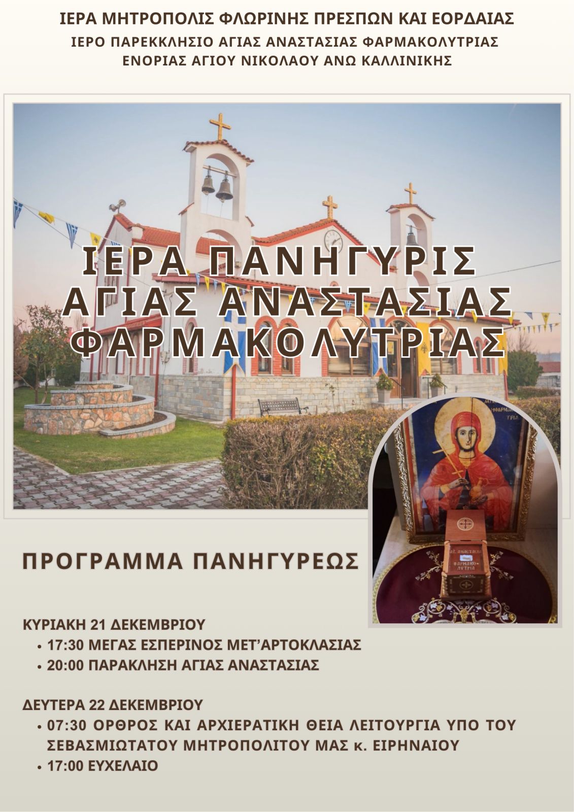 ΚοινωνίαΠανήγυρις Ιερού Παρεκκλησίου Αγίας Αναστασίας Φαρμακολυτρίας Άνω Καλλινίκης Φλώρινας Παρασκευή 19 Δεκεμβρίου, 2025 18:47 florinapress.gr SHARE Ίσως να ενδιαφέρει ... Η απεργιακή συγκέντρωση στη Φλώρινα Ευχαριστήριο του Πρότυπου Εκκλησιαστικού Λυκείου -Γυμνασίου Φλώρινας Μαθητές του Πειραματικού Δημοτικού Σχολείου επισκέφθηκαν το Νοσοκομείο και το Γηροκομείο Φλώρινας Συνελήφθη 26χρονος αλλοδαπός σε περιοχή της Φλώρινας, σε βάρος του οποίου εκκρεμούσε Ευρωπαϊκό Ένταλμα Σύλληψης Ισχυρή έκκληση περιορισμού των μετακινήσεων στις άκρως αναγκαίες Share Ακολουθήστε μας8.4kFollowersLikeΤελευταία νέα Φωτιές με την Εύξεινο Λέσχη Φλώρινας Εκδηλώσεις Πολιτισμός Παρασκευή 19 Δεκεμβρίου, 2025 Συγχαρητήριο μήνυμα Δημάρχου Αμυνταίου για τις διακρίσεις του Θωμά Γκιουλέκα, στο Πανελλήνιο Πρωτάθλημα Άρσης Βαρών Πολιτική Πολιτισμός Παρασκευή 19 Δεκεμβρίου, 2025 Ευχές από την Εύξεινο Λέσχη Φλώρινας Κοινωνία Πολιτισμός Παρασκευή 19 Δεκεμβρίου, 2025 Σταύρος Παπασωτηρίου: «Ταχύρρυθμο πρόγραμμα ξεναγών, σε συνεργασία με το Πανεπιστήμιο Μακεδονίας, στη Φλώρινα» Πολιτική Παρασκευή 19 Δεκεμβρίου, 2025