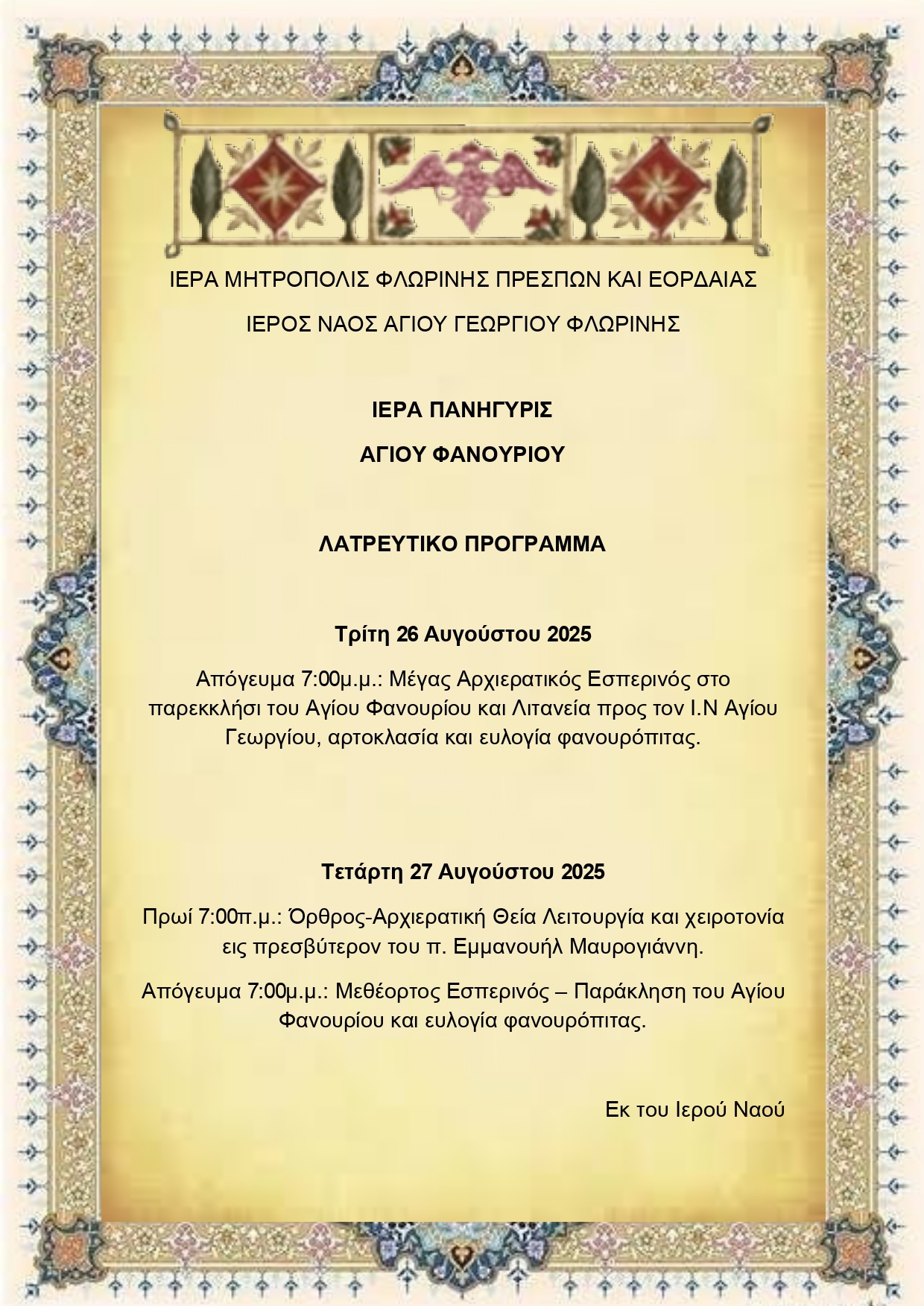 ΚοινωνίαΠανήγυρις Παρεκκλησίου Αγίου Φανουρίου Ιερού Ναού Αγίου Γεωργίου Φλώρινας Κυριακή 24 Αυγούστου, 2025 20:32 florinapress.gr SHARE Ίσως να ενδιαφέρει ... Κήρυγμα Ιεράς Μητροπόλεως Φλωρίνης, Πρεσπών και Εορδαίας για την Κυριακή Ι´ Λουκά (8 Δεκεμβρίου 2024) Βασίλης Ντώνος: Απάντηση προς την αυτοαποκαλούμενη επιτροπή αγώνα κατοίκων Αχλάδας Εκδήλωση του Συλλόγου συνταξιούχων δασκάλων και νηπιαγωγών Φλώρινας για τη γιορτή της μητέρας Νέες ηλεκτρονικές υπηρεσίες του e-ΕΦΚΑ Οι τυχεροί λαχνοί της λαχειοφόρου αγοράς των Σαρισών Φλώρινας Share Ακολουθήστε μας8.4kFollowersLikeΤελευταία νέα Αγανακτισμένοι αγρότες : Ως εδώ, η κατάσταση δεν πάει άλλο Κοινωνία Πέμπτη 4 Δεκεμβρίου, 2025 Επισκέψεις Κινητών Μονάδων Υγείας σε απομακρυσμένες Κοινότητες του Δήμου Αμυνταίου Κοινωνία Πέμπτη 4 Δεκεμβρίου, 2025 Ευχαριστήρια επιστολή του Πειραματικού Σχολείου Φλώρινας προς το Κέντρο Περιβαλλοντικής Εκπαίδευσης & Αειφορίας Μελίτης Κοινωνία Πέμπτη 4 Δεκεμβρίου, 2025 Πωλείται Γερμανικός λέβητας ξύλου Κοινωνία Πέμπτη 4 Δεκεμβρίου, 2025