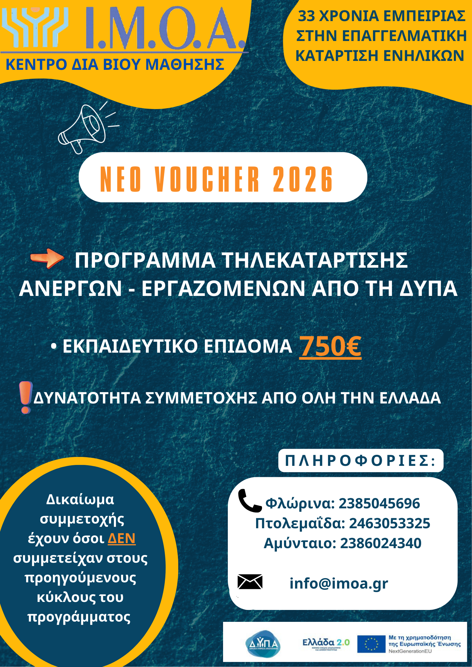 ΚοινωνίαΠρόγραμμα τηλεκατάρτισης ανέργων – εργαζομένων από τη ΔΥΠΑ Δευτέρα 26 Ιανουαρίου, 2026 14:29 florinapress.gr SHARE Ίσως να ενδιαφέρει ... Μήνυμα του Αντιπεριφερειάρχη Φλώρινας Αθανάσιου Τάσκα για την Παγκόσμια Ημέρα Αγρότισσας Τα δικαιολογητικά για τα Αριστεία της Ευξείνου Λέσχης Φλώρινας Χορός αποφοίτων Σχολείου Δεύτερης Ευκαιρίας Συλλυπητήριο μήνυμα του Δημάρχου Φλώρινας Βασίλη Γιαννάκη Διακοπή ηλεκτροδότησης σε τοπικές κοινότητες του Δήμου Φλώρινας Share Ακολουθήστε μας8.4kFollowersLikeΤελευταία νέα Κηδεία της Αλίκης Ράμμου, ετών 76 Κοινωνικά Δευτέρα 26 Ιανουαρίου, 2026 ΕΣΑμεΑ: Με βαριά καρδιά και συγκίνηση αποχαιρετούμε τον Μιχάλη Μήγγο Κοινωνία Δευτέρα 26 Ιανουαρίου, 2026 Μαύρη σελίδα για την εργατική τάξη – Η τραγωδία στα Τρίκαλα δεν πρέπει να μείνει ατιμώρητη Κοινωνία Δευτέρα 26 Ιανουαρίου, 2026 Επισκέψεις κινητών ομάδων του ΕΟΔΥ σε Λέχοβο και Σκλήθρο Κοινωνία Δευτέρα 26 Ιανουαρίου, 2026