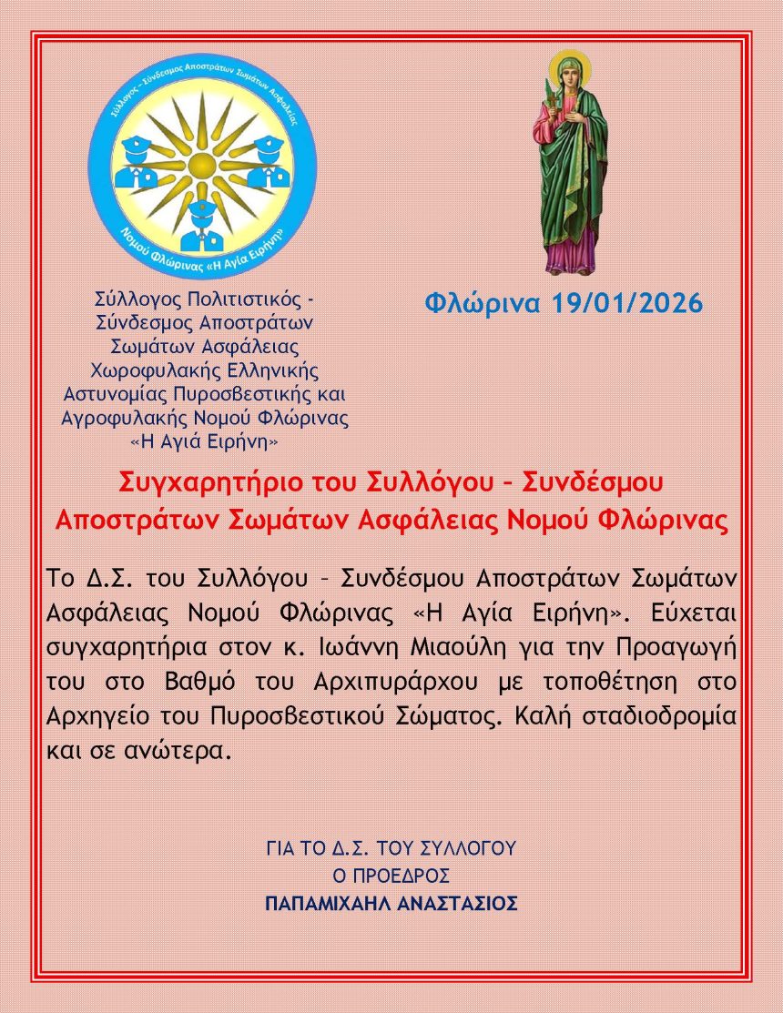 Το Δ.Σ. του Συλλόγου – Συνδέσμου Αποστράτων Σωμάτων Ασφάλειας Νομού Φλώρινας «Η Αγία Ειρήνη». Εύχεται συγχαρητήρια στον κ. Ιωάννη Μιαούλη για την Προαγωγή του στο Βαθμό του Αρχιπυράρχου με τοποθέτηση στο Αρχηγείο του Πυροσβεστικού Σώματος. Καλή σταδιοδρομία και σε ανώτερα.