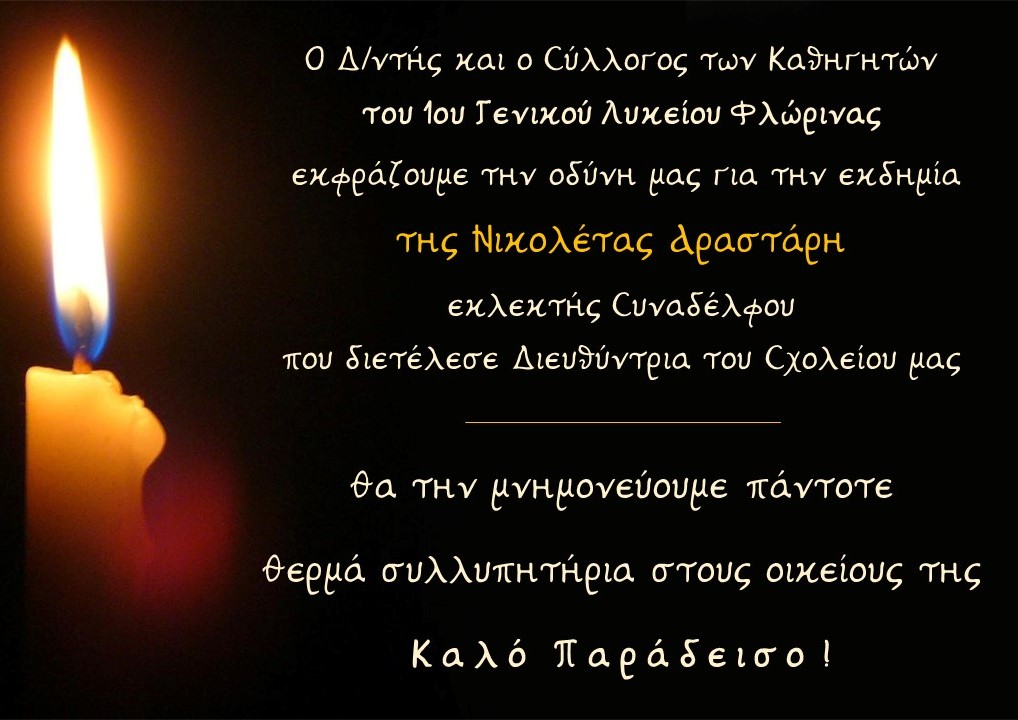 ΚοινωνίαΣυλλυπητήριο μήνυμα του 1ου ΓΕΛ Φλώρινας Δευτέρα 16 Μαρτίου, 2026 14:17 florinapress.gr xr:d:DAFaEqzR9-g:131,j:43771841324,t:23032212 SHARE +Ίσως να ενδιαφέρει ... Γίνε συγγραφέας με την τεχνητή νοημοσύνη (AI)! Συλλυπητήριο μήνυμα του Δημάρχου Φλώρινας 46 τα ενεργά κρούσματα στην Π.Ε. Φλώρινας Η εκδήλωση του Συλλόγου Συνταξιούχων Καθηγητών και Φίλων Φλώρινας Ο εορτασμός του Δεκαπενταύγουστου στην Τ.Κ. Σκοπιάς Share Ακολουθήστε μας8.4kFollowersLikeΤελευταία νέα Πέτη Πέρκα: Η κυβέρνηση φροντίζει για τα κέρδη των λίγων και οι πολίτες του νομού Φλώρινας πληρώνουν το τίμημα Πολιτική Δευτέρα 16 Μαρτίου, 2026 Υποβολή αιτήσεων για εισαγωγή στο Πειραματικό Δημοτικό Σχολείο Φλώρινας Κοινωνία Δευτέρα 16 Μαρτίου, 2026 Συλλυπητήριο μήνυμα του Συλλόγου εκπαιδευτικών Πρωτοβάθμιας Εκπαίδευσης Φλώρινας Κοινωνία Δευτέρα 16 Μαρτίου, 2026 Συνάντηση του Δημάρχου Αμυνταίου Ιωάννη Λιάση με τον νέο Διοικητή του 1ου Συντάγματος Πεζικού Ανέστη Ανέστη Πολιτική Δευτέρα 16 Μαρτίου, 2026
