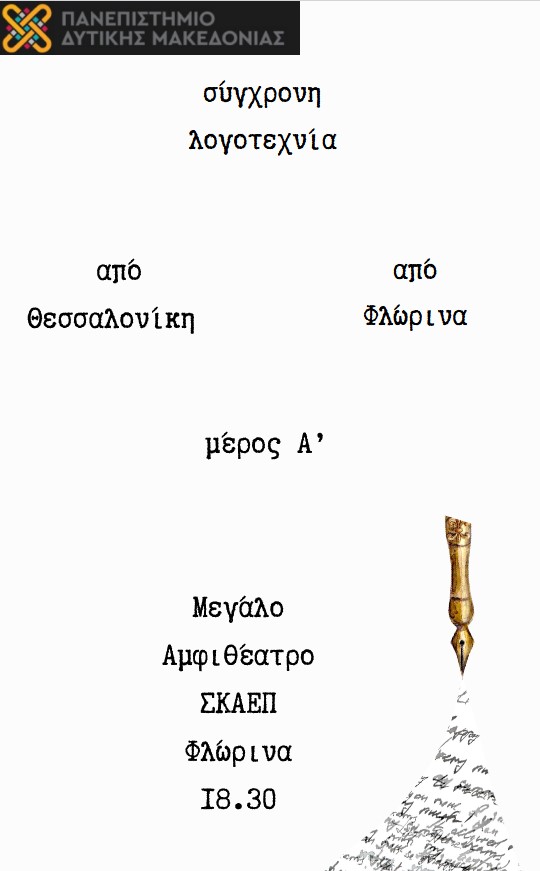 Οι φοιτητές και οι φοιτήτριες του Τμήματος Νηπιαγωγών του Πανεπιστημίου Δυτικής Μακεδονίας στο πλαίσιο των μαθημάτων Λογοτεχνίας και Δημιουργικής Γραφής (διδάσκων/ουσα: κ. Βακάλη Άννα – κ. Κωτόπουλος Τριαντάφυλλος) διοργανώνουν σειρά παρουσιάσεων με θέμα «Σύγχρονοι Λογοτέχνες από τη Θεσσαλονίκη και τη Φλώρινα».