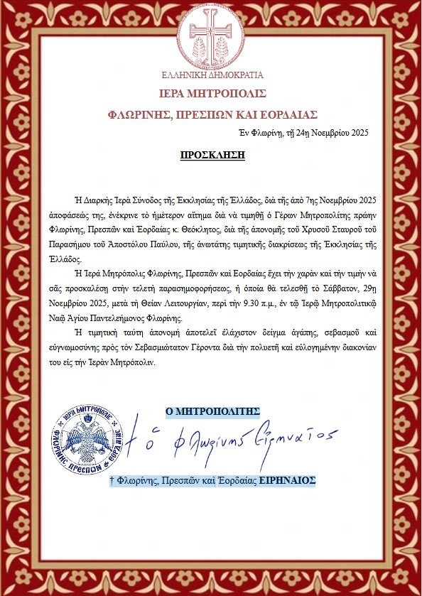 Ἡ Ἱερά Μητρόπολις Φλωρίνης, Πρεσπῶν καὶ Εορδαίας ἔχει τὴν χαρὰν καὶ τὴν τιμὴν νὰ