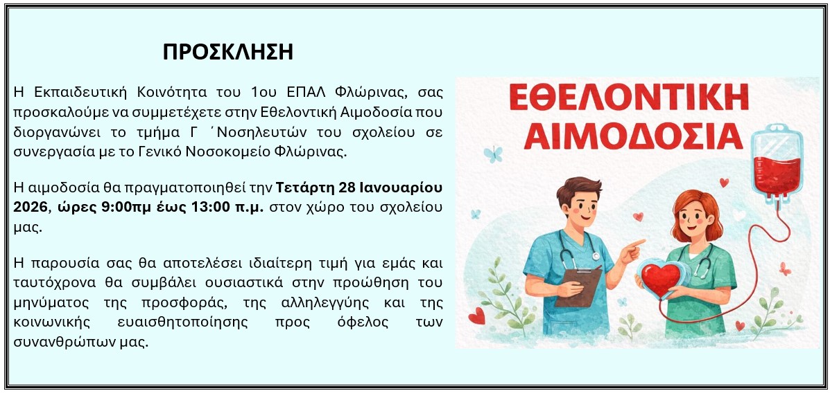 Το Τμήμα Γ’ Νοσηλευτών του 1ου ΕΠΑΛ Φλώρινας απευθύνει ανοιχτή πρόσκληση σε όλους τους πολίτες της Φλώρινας να συμμετάσχουν στην Εθελοντική Αιμοδοσία που διοργανώνει σε συνεργασία με το Γενικό Νοσοκομείο Φλώρινας και θα πραγματοποιηθεί την Τετάρτη 28 Ιανουαρίου 2026, από τις 9:00 π.μ. έως τις 13:00 μ.μ., στον χώρο του σχολείου.