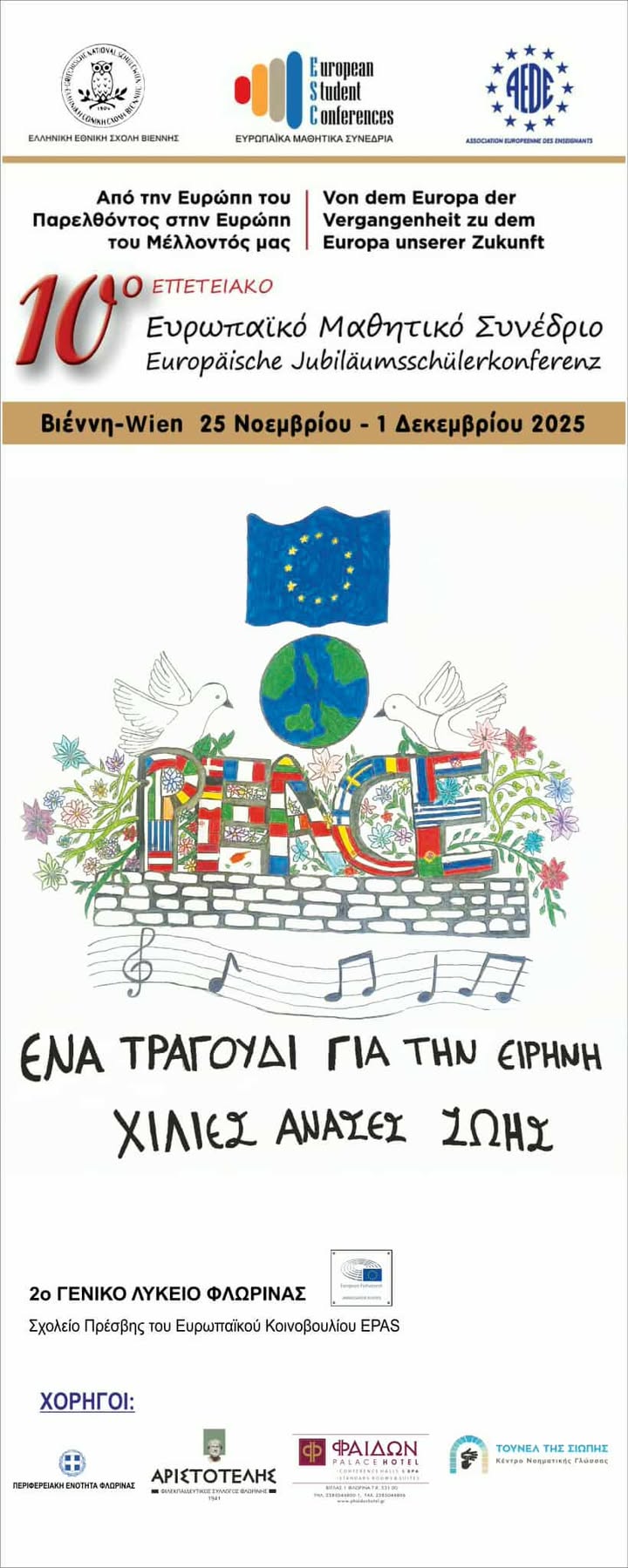 Το 2ο Γενικό Λύκειο Φλώρινας θα εκπροσωπήσει φέτος την περιοχή μας στο 10ο Ευρωπαϊκό Μαθητικό Συνέδριο που θα πραγματοποιηθεί στη Βιέννη από 25 Νοεμβρίου έως 1 Δεκεμβρίου, παρουσιάζοντας ένα ολοκληρωμένο καλλιτεχνικό έργο με κεντρικό θέμα την παγκόσμια ειρήνη.