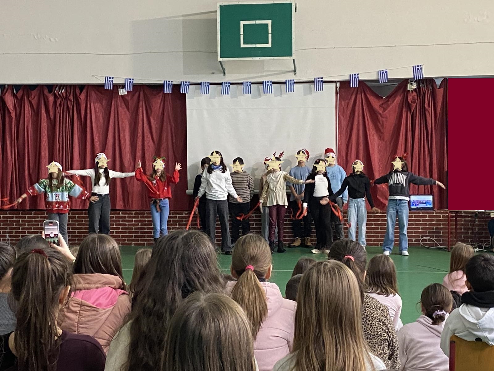 Στη συνέχεια, οι μαθητές της Ε΄ τάξης, με την καθοδήγηση της δασκάλας τους, κ. Πήτα, παρουσίασαν ένα συγκινητικό και πρωτότυπο τραγούδι. Το τραγούδι αυτό το έγραψαν και το μελοποίησαν οι ίδιοι, χρησιμοποιώντας καινοτόμα την τεχνητή νοημοσύνη, κερδίζοντας το θερμό χειροκρότημα όλων. Η δημιουργικότητά τους ανέδειξε τη δύναμη της συνεργασίας και το μήνυμα της ενότητας.