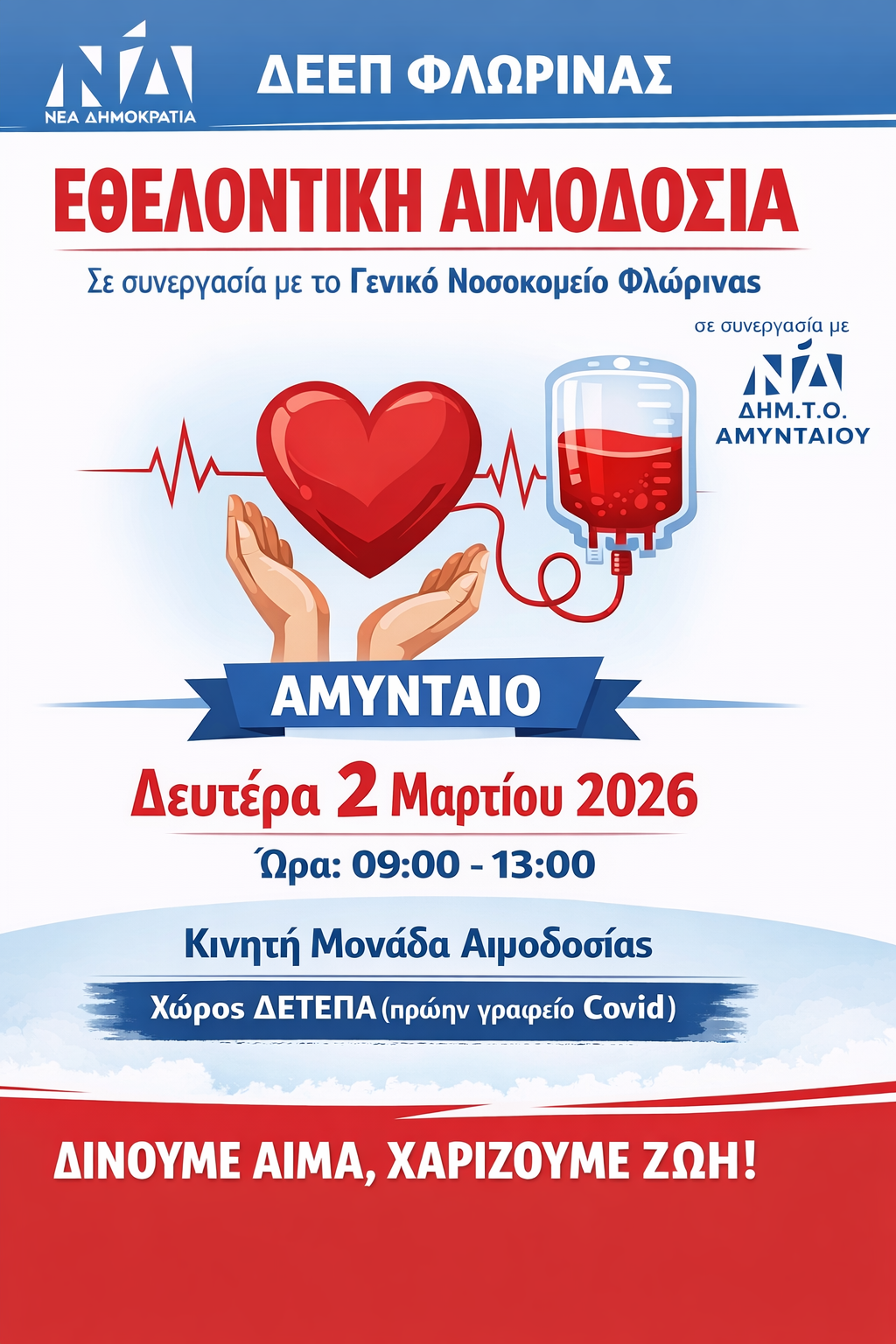 ΚοινωνίαΠολιτικήΑιμοδοσια στο Αμύνταιο από τη ΔΕΕΠ Φλώρινας και τη ΔΗΜ.ΤΟ Αμυνταίου ΝΔ Πέμπτη 26 Φεβρουαρίου, 2026 19:26 florinapress.gr SHARE Ίσως να ενδιαφέρει ... 15 Μαρτίου – Ημέρα καταναλωτή δεν ψωνίζω – δείχνω τη δύναμή μου! Επιτροπή Αγώνα Ενάντια στο κλείσιμο του ΑΗΣ Μελίτης: Εργαζόμενοι και κάτοικοι της Μελίτης δε δεχόμαστε το κλείσιμο του ΑΗΣ! Πρέπει να σημάνει ξεσηκωμός! Δραστηριοποίηση πωλητών λαϊκής αγοράς Λ. Μόδη και παράλληλης λαϊκής αγοράς του Δήμου Φλώρινας την Τετάρτη 30-12-2020 Συνάντηση Στ. Παπασωτηρίου – Άδ. Γεωργιάδη για εργασιακά θέματα της Φλώρινας Συνάντηση του Τρύφωνα Γρομπανόπουλου με τον Διευθυντή του ΑΗΣ Αμυνταίου-Φιλώτα Share Ακολουθήστε μας8.4kFollowersLikeΤελευταία νέα Ο Ε΄ Κατανυκτικός Εσπερινός στην Ιερά Μητρόπολη Φλωρίνης, Πρεσπών και Εορδαίας Κοινωνία Πέμπτη 19 Μαρτίου, 2026 Ανακοίνωση του Οδοντιατρικού Συλλόγου Φλώρινας για την Παγκόσμια ημέρα Στοματικής Υγείας Κοινωνία Πέμπτη 19 Μαρτίου, 2026 Κηδεία του Θωμά Πέικου, ετών 90 Κοινωνικά Πέμπτη 19 Μαρτίου, 2026 Συνάντηση εκπροσώπων φοιτητικών συλλόγων με τον Δήμαρχο Φλώρινας Πολιτική Τετάρτη 18 Μαρτίου, 2026