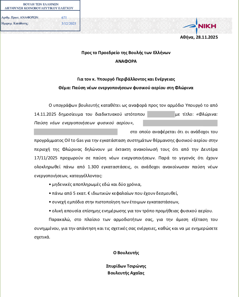 Σχετικά με το πρόβλημα που ανέκυψε με την παύση των εργασιών εγκατάστασης φυσικού αερίου στην πόλη της Φλώρινας, το Κίνημά μας κατέθεσε στα πλαίσια του κοινοβουλευτικού ελέγχου αναφορά προς τον αρμόδιο Υπουργό (αρ.πρωτ.671 / 3.12.2025)