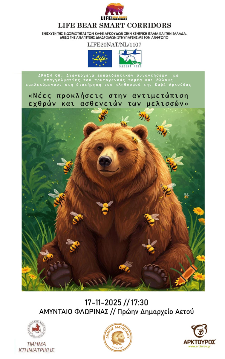 Το Εργαστήριο Μικροβιολογίας και Παρασιτολογίας του Τμήματος Κτηνιατρικής του Πανεπιστημίου Θεσσαλίας, σε συνεργασία με τον Δήμο Αμυνταίου, υλοποιεί σειρά εκπαιδευτικών δράσεων με στόχο την υποστήριξη των παραγωγών που δραστηριοποιούνται σε περιοχές του Δήμου με τεκμηριωμένη παρουσία της καφέ αρκούδας.