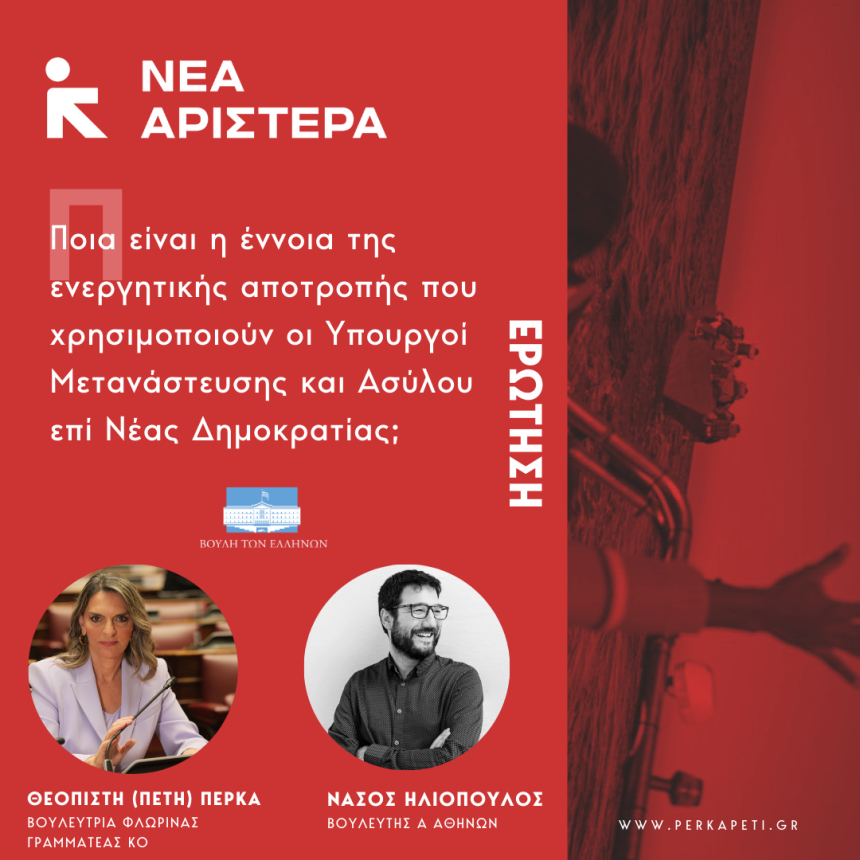 Να εξηγήσουν τι ακριβώς σημαίνει ο όρος ενεργητική αποτροπή που αναφέρουν σε δηλώσεις τους οι Υπουργοί Μετανάστευσης και Ασύλου και ποιες ενέργειες συμπεριλαμβάνονται στην έννοια της αποτροπής, ζητούν δέκα (10) Βουλευτές της Νέας Αριστεράς με ερώτηση που κατέθεσαν, με πρωτοβουλία της Πέτης Πέρκα και του Νάσου Ηλιόπουλου.