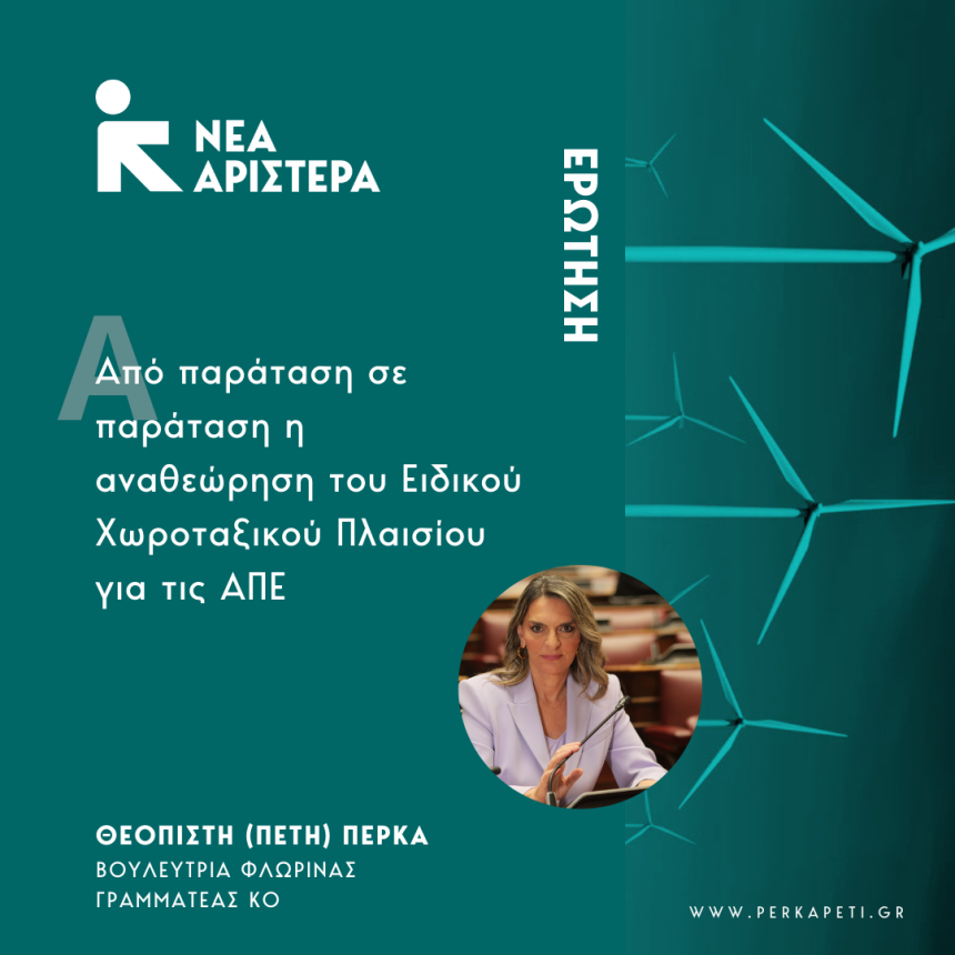 Ότι οι παρατάσεις δεν έχουν τέλος στην ολοκλήρωση της αναθεώρησης του Ειδικού Χωροταξικού Πλαισίου για τις Ανανεώσιμες Πηγές Ενέργειας (ΕΧΠ για τις ΑΠΕ) τονίζουν, με ερώτηση που κατέθεσαν επτά (7) Βουλευτές της Νέας Αριστεράς, με πρωτοβουλία της Βουλεύτριας Φλώρινας και Γραμματέα της ΚΟ, Πέτης Πέρκα.