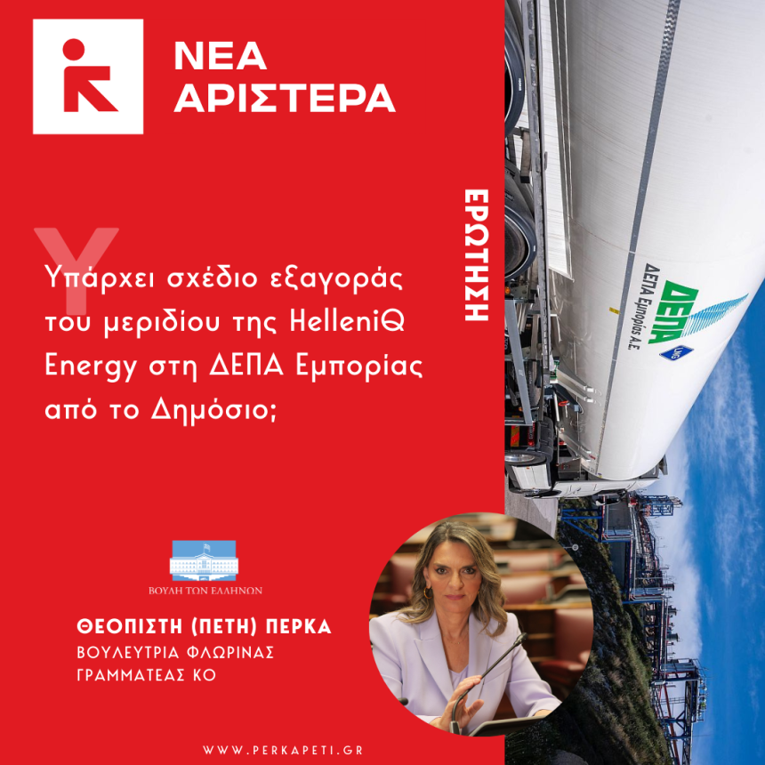 Ερώτηση και Αίτηση Κατάθεσης Εγγράφων για τα σενάρια που θέλουν το Υπερταμείο (Ελληνική Εταιρεία Συμμετοχών και Περιουσίας) να εξαγοράζει το 35% της ΔΕΠΑ Εμπορίας από την HelleniQ Energy, κατέθεσαν από κοινού η Βουλεύτρια Φλώρινας και Γραμματέας της ΚΟ της Νέας Αριστεράς, Πέτη Πέρκα και ο Βουλευτής Β1′ Βόρειου Τομέα Αθηνών της Νέας Αριστεράς, Ευκλείδης Τσακαλώτος, την οποία συνυπογράφουν πέντε (5) Βουλευτές.