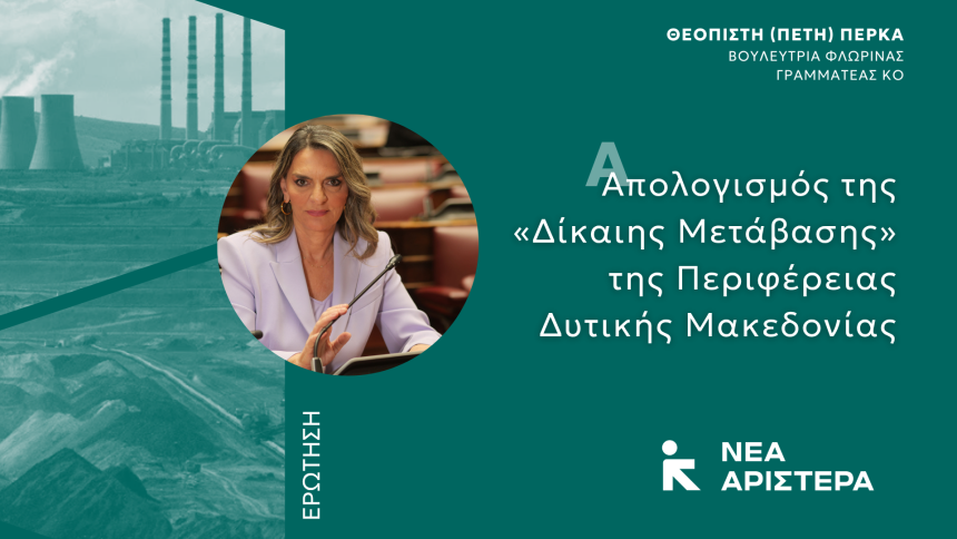 Επτά (07) Βουλευτές της Νέας Αριστεράς, μετά από πρωτοβουλία της Βουλεύτριας Φλώρινας και Γραμματέα της Κ.Ο. της Νέας Αριστεράς Πέτης Πέρκα κατέθεσαν ερώτηση και Αίτηση Κατάθεσης Εγγράφων (ΑΚΕ) προς τον Υπουργό Εθνικής Οικονομίας και Οικονομικών (αρμόδιο για την απολιγνιτοποίηση) καθώς και στον Υπουργό Περιβάλλοντος και Ενέργειας σχετικά με την πορεία της δήθεν «Δίκαιης Μετάβασης»  και της απολιγνιτοποίησης της Περιφέρειας Δυτικής Μακεδονίας, ζητώντας συγκεκριμένα στοιχεία και όχι λόγια του αέρα.