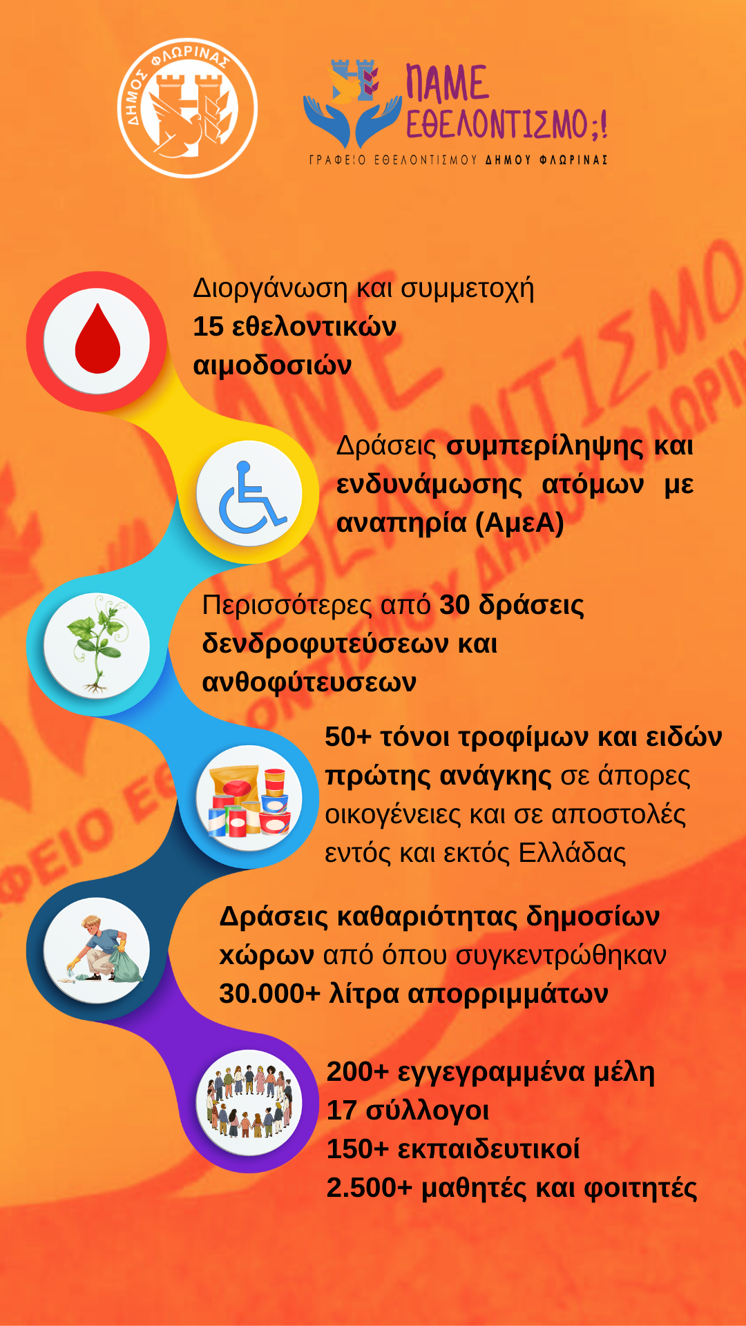 Μάλιστα, φέτος είναι μια ξεχωριστή χρονιά, καθώς το Γραφείο Εθελοντισμού του Δήμου Φλώρινας, συμπληρώνει 5 χρόνια λειτουργίας. Μέσα σε αυτή την πενταετία, το Γραφείο Εθελοντισμού έχει καταγράψει αξιοσημείωτη δράση, με έντονο κοινωνικό και περιβαλλοντικό αποτύπωμα.