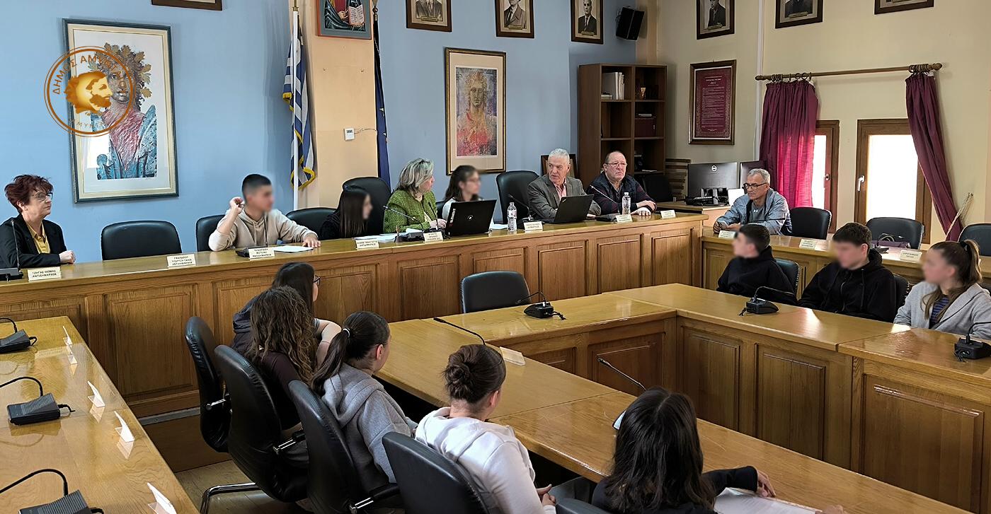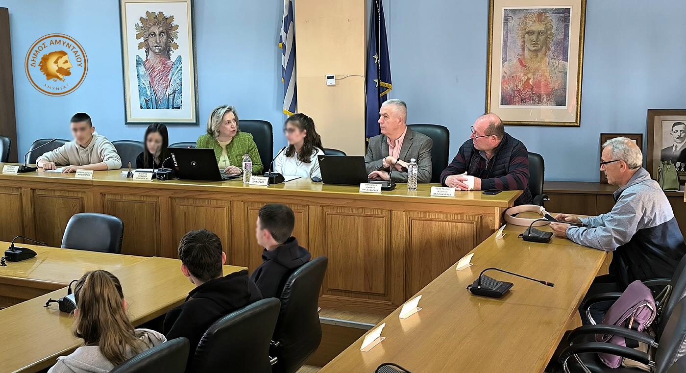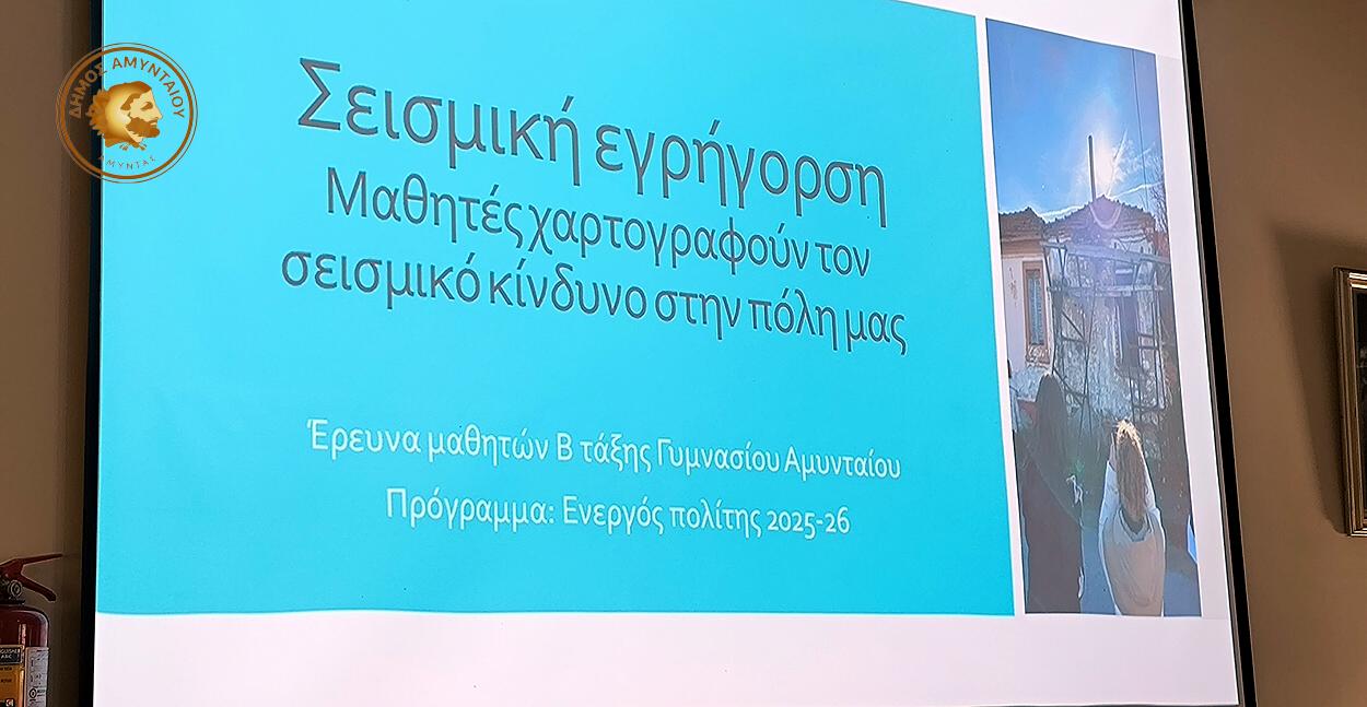 Μια ιδιαίτερα ενδιαφέρουσα και ουσιαστική επίσκεψη πραγματοποίησαν στο Δημαρχείο Αμυνταίου μαθητές και μαθήτριες της Β’ Τάξης του Γυμνασίου Αμυνταίου, συνοδευόμενοι από τις καθηγήτριες κα. Γρομπανοπούλου και κα. Ρούσσου, προκειμένου να παρουσιάσουν την εργασία τους με θέμα την αντισεισμική προστασία.