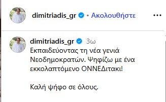 Ο κ. Δημητριάδης προχώρησε σε σχετική ανάρτηση, γράφοντας «Εκπαιδεύοντας τη νέα γενιά Νεοδημοκρατών. Ψηφίζω με ένα εκκολαπτόμενο ΟΝΝΕΔιτακι!