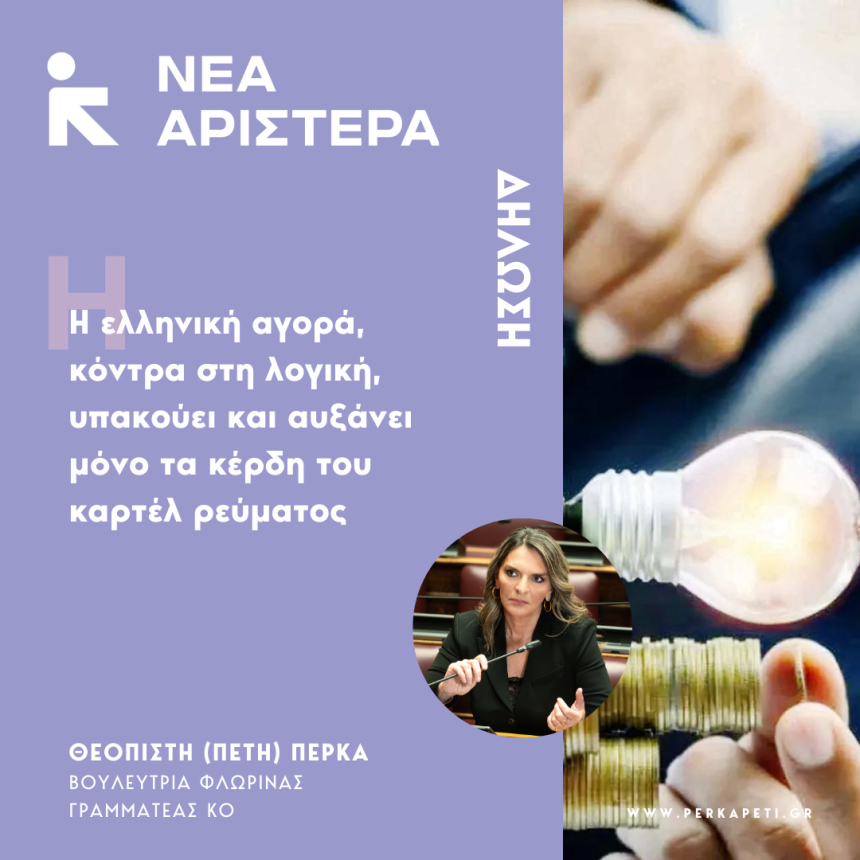 Με την ανοχή της κυβέρνησης της Νέας Δημοκρατίας οι τιμές ρεύματος είναι κόντρα στη λογική γιατί, όπως γνωρίζουμε όλες και όλοι καλά, υπακούν μόνο στη λογική και άρα στα κέρδη που επιθυμεί το καρτέλ στην ελληνική αγορά ρεύματος.