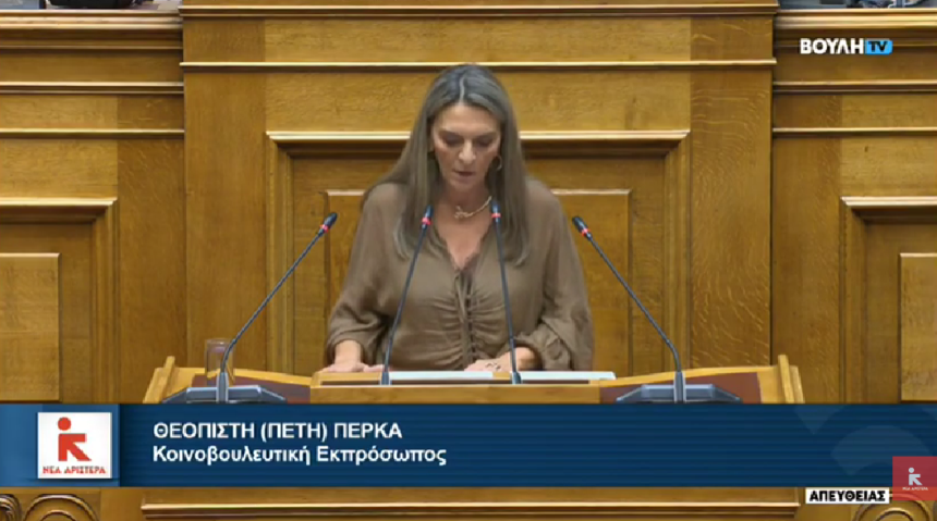Για μια νέα παγκόσμια πραγματικότητα, όπου ο πόλεμος παύει να είναι εξαίρεση έκανε λόγο η βουλεύτρια Φλώρινας και γραμματέας της Κοινοβουλευτικής Ομάδας της Νέας Αριστεράς, Πέτη Πέρκα, μιλώντας στην Βουλή για τους εξοπλισμούς, με αφορμή τη συζήτηση για το νομοσχέδιο του υπουργείου Εθνικής Άμυνας.