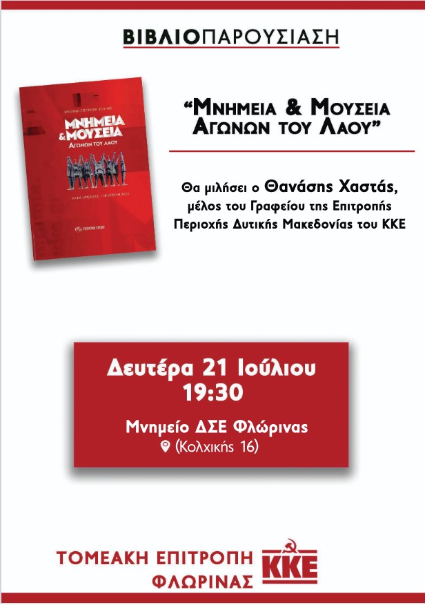 Η Τομεακή Επιτροπή Φλώρινας του ΚΚΕ σας προσκαλεί στην παρουσίαση της έκδοσης της Σύγχρονης Εποχής «ΜΗΝΜΕΙΑ ΚΑΙ ΜΟΥΣΕΙΑ ΑΓΩΝΩΝ ΤΟΥ ΛΑΟΥ» τη Δευτέρα 21 Ιούλη ώρα 19.30 στον χώρο του Μνημείου ΔΣΕ Φλώρινας (Κολχικής 16). Θα µιλήσει ο Θανάσης Χαστάς, µέλος του Γραφείου της Επιτροπής Περιοχής Δυτικής Μακεδονίας του ΚΚΕ.