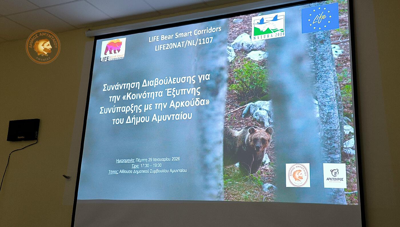 Με επιτυχία πραγματοποιήθηκε την Πέμπτη 29 Ιανουαρίου 2026, στην Αίθουσα Δημοτικού Συμβουλίου Αμυνταίου, η ανοιχτή συνάντηση εργασίας και διαβούλευσης για τη δημιουργία της «Κοινότητας Έξυπνης Συνύπαρξης με την Αρκούδα», στο πλαίσιο της συμμετοχής του Δήμου Αμυνταίου στο ευρωπαϊκό πρόγραμμα LIFE Bear-Smart Corridors, σε συνεργασία με την περιβαλλοντική οργάνωση ΑΡΚΤΟΥΡΟΣ.