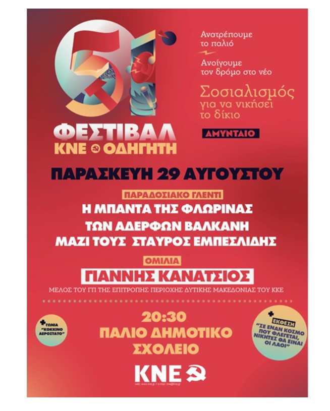 Με σύνθημα “Ανατρέπουμε το παλιό, ανοίγουμε το δρόμο στο νέο. Σοσιαλισμός για να νικήσει το δίκιο!”, το 51ο Φεστιβάλ ΚΝΕ-Οδηγητή συνεχίζει το ταξίδι του στη Δυτική Μακεδονία, με επόμενο σταθμό, το Αμύνταιο Φλώρινας, στο Παλιό Δημοτικό Σχολείο, την Παρασκευή 29 Αυγούστου.