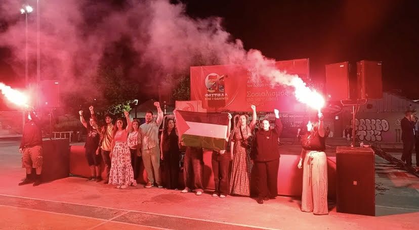 Μετά την ολοκλήρωση της κεντρικής ομιλίας μέλη και φίλοι της ΚΝΕ ύψωσαν στο κέντρο του Φεστιβάλ την Παλαιστινιακή σημαία και με υψωμένες γροθιές φώναξαν συνθήματα ενάντια στην εμπλοκή της χώρας μας στους πολέμους σε Ουκρανία και Μέση Ανατολή, δείχνοντας και από την πόλη της Φλώρινας την αλληλεγγύη στον Παλαιστινιακό λαό.