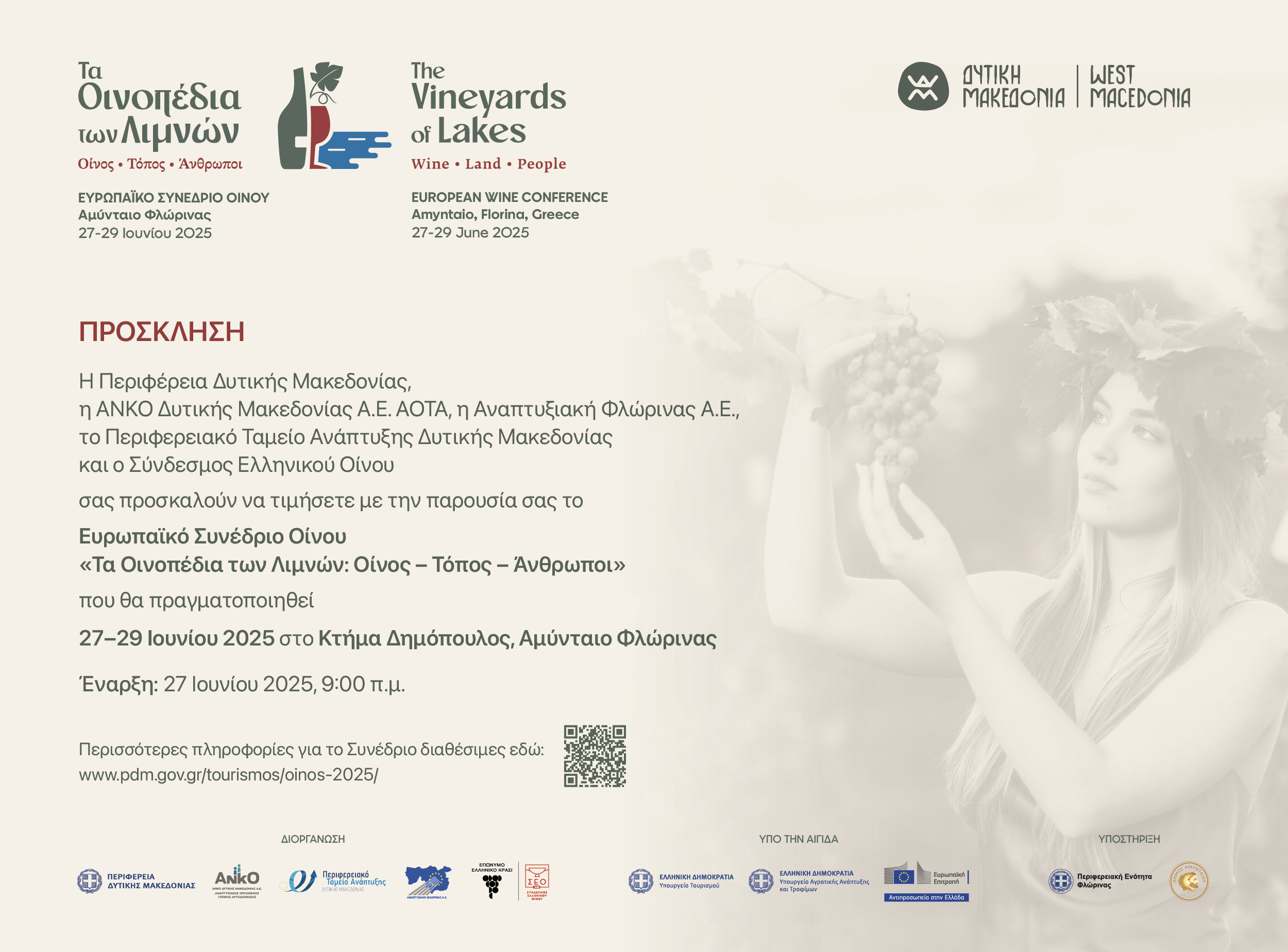 Η Περιφέρεια Δυτικής Μακεδονίας, η ΑΝΚΟ Δυτικής Μακεδονίας Α.Ε. – Αναπτυξιακός Οργανισμός Τοπικής Αυτοδιοίκησης, η Αναπτυξιακή Φλώρινας Α.Ε., το Περιφερειακό Ταμείο Ανάπτυξης Δυτικής Μακεδονίας και ο Σύνδεσμος Ελληνικού Οίνου σας προσκαλούν να παρακολουθήσετε το Ευρωπαϊκό Συνέδριο Οίνου με τίτλο: «Τα Οινοπέδια των Λιμνών: Οίνος – Τόπος – Άνθρωποι».
