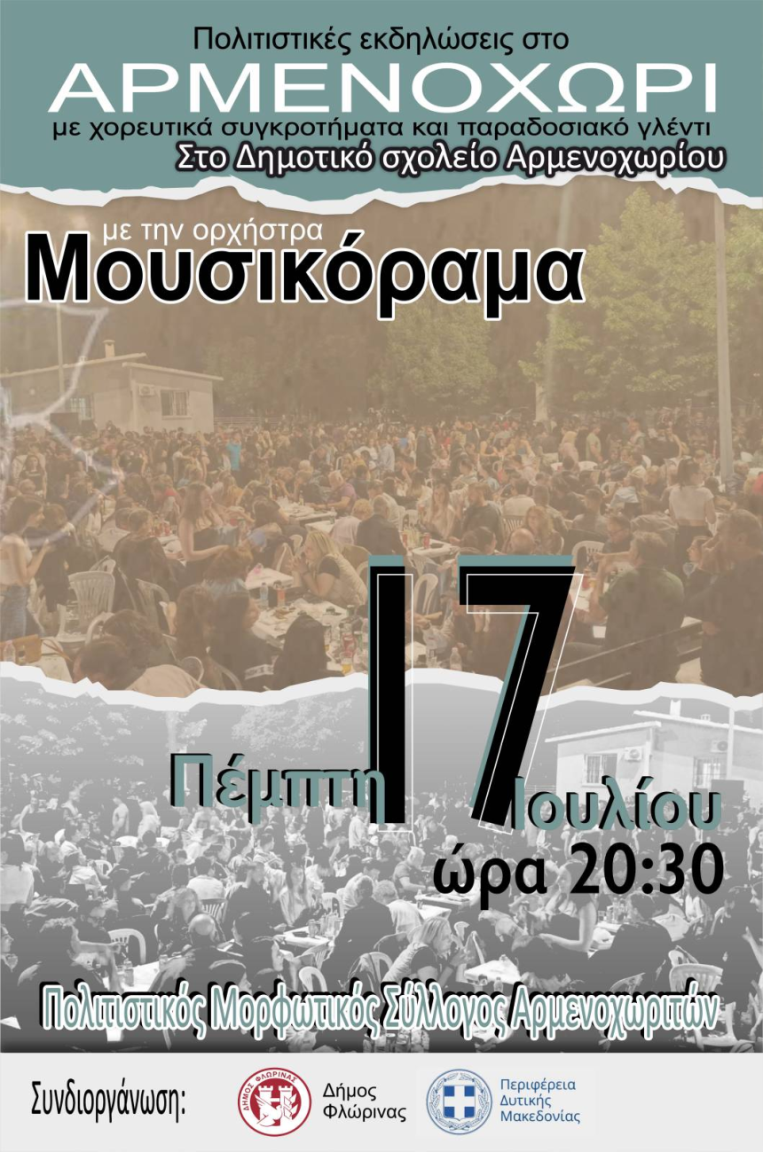 Ο Π. Μ. Σ. Αρμενοχωριτών σας προσκαλεί στην εκδήλωση που θα γίνει στις ,17 Ιουλίου 2025 και ωρα 20:30 στο Δημοτικό Σχολείο Αρμενοχωρίου με τη συμμετοχή χορευτικών τμημάτων του χωριού και άλλων Συλλόγων και εν συνεχεία παραδοσιακό γλέντι.