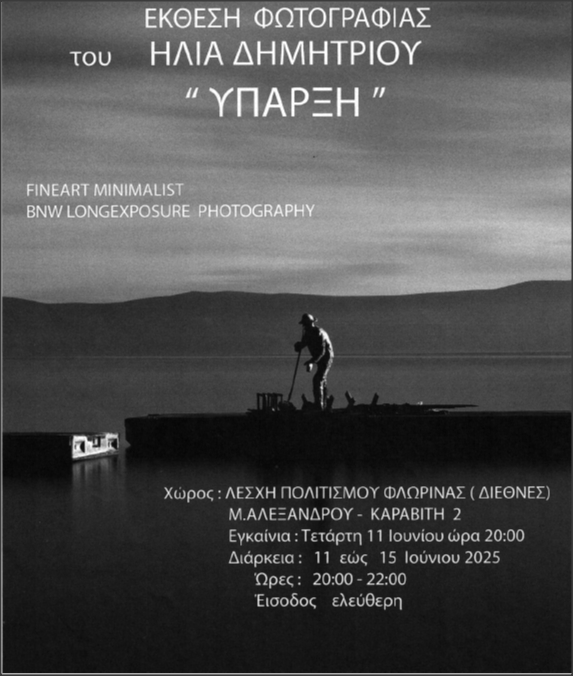 Η Λέσχη Πολιτισμού Φλώρινας, διοργανώνει έκθεση ασπρόμαυρης φωτογραφίας (Fineart Minimalist BNW Longexposure Photography), του Ηλία Δημητρίου, στους χώρους της Λέσχης Πολιτισμού Φλώρινας (πρώην ξενοδοχείο Διεθνές), με θέμα «Ύπαρξη».