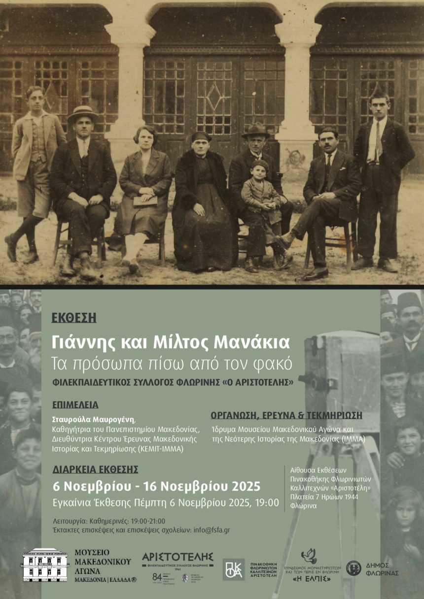 Η Έκθεση του Ιδρύματος Μουσείου Μακεδονικού Αγώνα και της Νεότερης Ιστορίας της Μακεδονίας (ΙΜΜΑ) «Γιάννης και Μίλτος Μανάκια. Τα πρόσωπα πίσω από τον φακό» συνεχίζει την επιτυχημένη περιοδεία της σε όλη την Ελλάδα. Επόμενος σταθμός της είναι η Φλώρινα. Η Έκθεση θα φιλοξενηθεί στην Αίθουσα εκθέσεων της Πινακοθήκης Φλωρινιωτών Καλλιτεχνών «Αριστοτέλη» από τις 6 έως τις 16 Νοεμβρίου 2025.