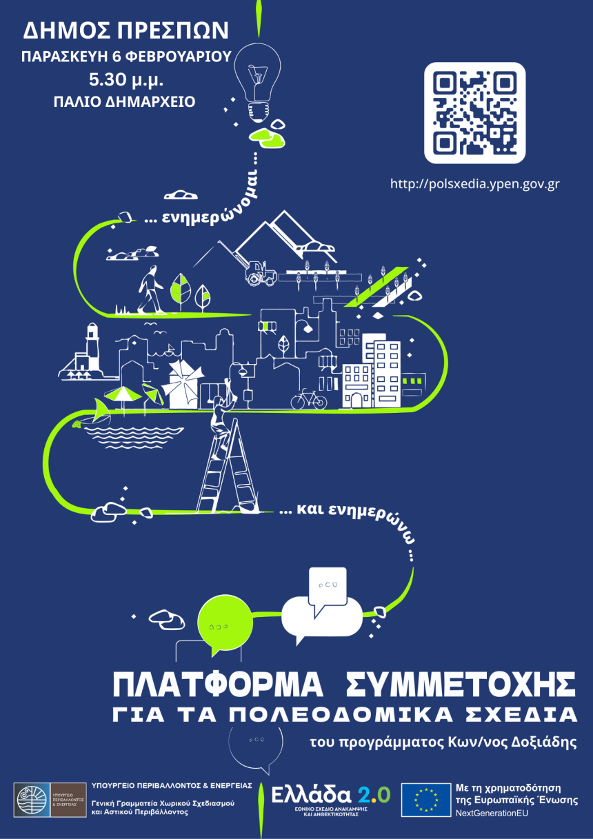 Ο Δήμος Πρεσπών προσκαλεί τους δημότες, τους φορείς και κάθε ενδιαφερόμενο, την Παρασκευή 6 Φεβρουαρίου 2026 και ώρα 17:30 στην αίθουσα συνεδριάσεων «Λάζαρος Ναλπαντίδης» στο παλιό Δημαρχείο Πρεσπών στον Λαιμό, για την παρουσίαση των Εναλλακτικών Σεναρίων Χωρικής Ανάπτυξης της μελέτης «Τοπικού Πολεοδομικού Σχεδίου Δήμου Πρεσπών (ΔΕ Πρεσπών, ΔΕ Κρυσταλλοπηγής)».
