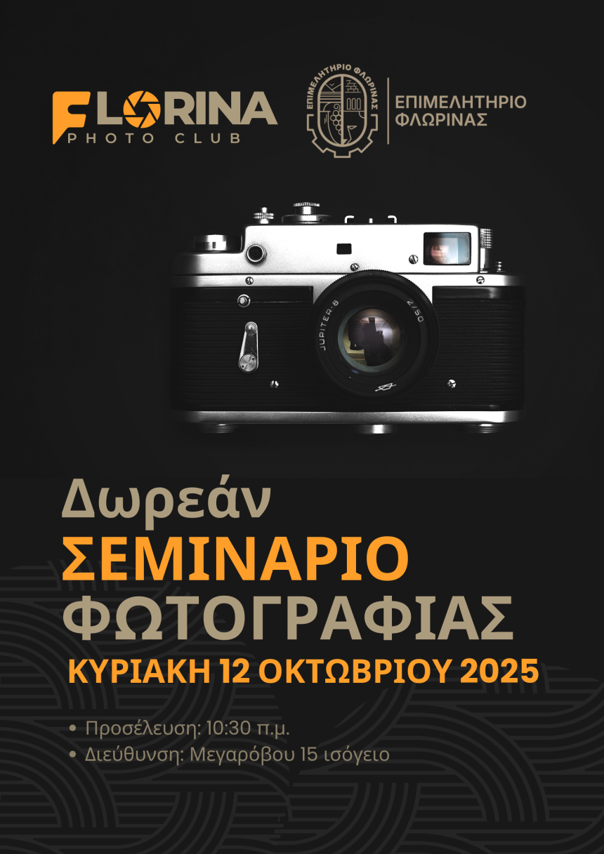 Την Κυριακή 12 Οκτωβρίου 2025, η Φωτογραφική Λέσχη Φλώρινας, σε συνεργασία με το Επιμελητήριο Φλώρινας, παρουσιάζει ένα ΔΩΡΕΑΝ σεμινάριο φωτογραφίας με εισηγητή τον Κώστα Παπαϊωάννου, βραβευμένο φωτογράφο και καθηγητή φωτογραφίας.