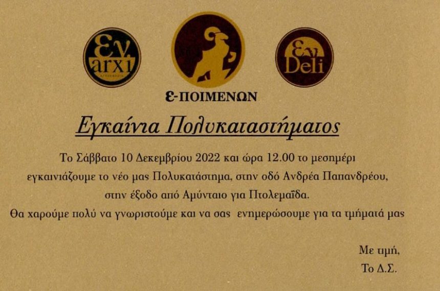 Το Σάββατο 10 Δεκεμβρίου 2022 και ώρα 12:00 το μεσημέρι εγκαινιάζουμε το νέο μας Πολυκατάστημα, στην οδό Ανδρέα Παπανδρέου, στην έξοδο από Αμύνταιο για Πτολεμαΐδα.