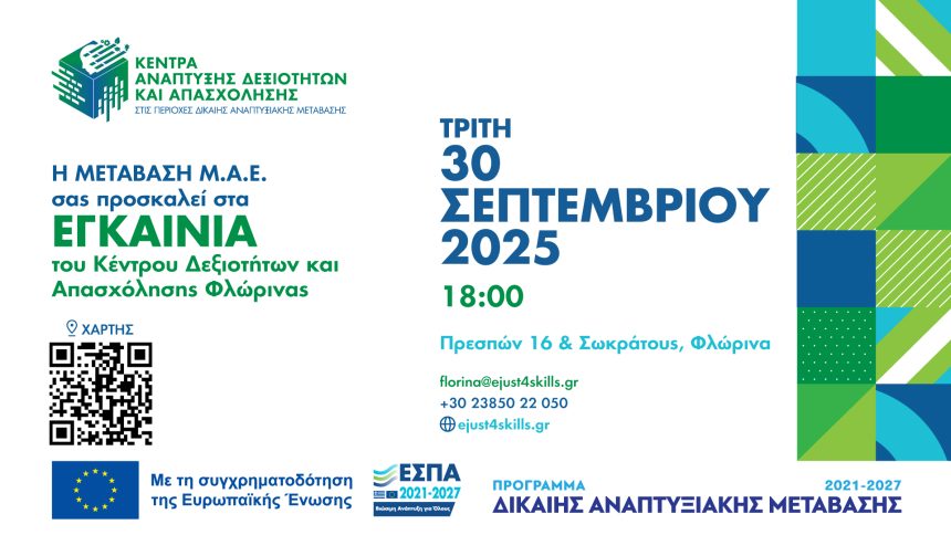 Με ιδιαίτερη χαρά και τιμή, το Κέντρο Ανάπτυξης Δεξιοτήτων και Απασχόλησης Φλώρινας ανακοινώνει τα επίσημα εγκαίνιά του, τα οποία θα πραγματοποιηθούν την Τρίτη, 30 Σεπτεμβρίου 2025 και ώρα 18:00 μ.μ., στον νέο του χώρο στην Πρεσπών 16 και Σωκράτους, στο κέντρο της Φλώρινας.