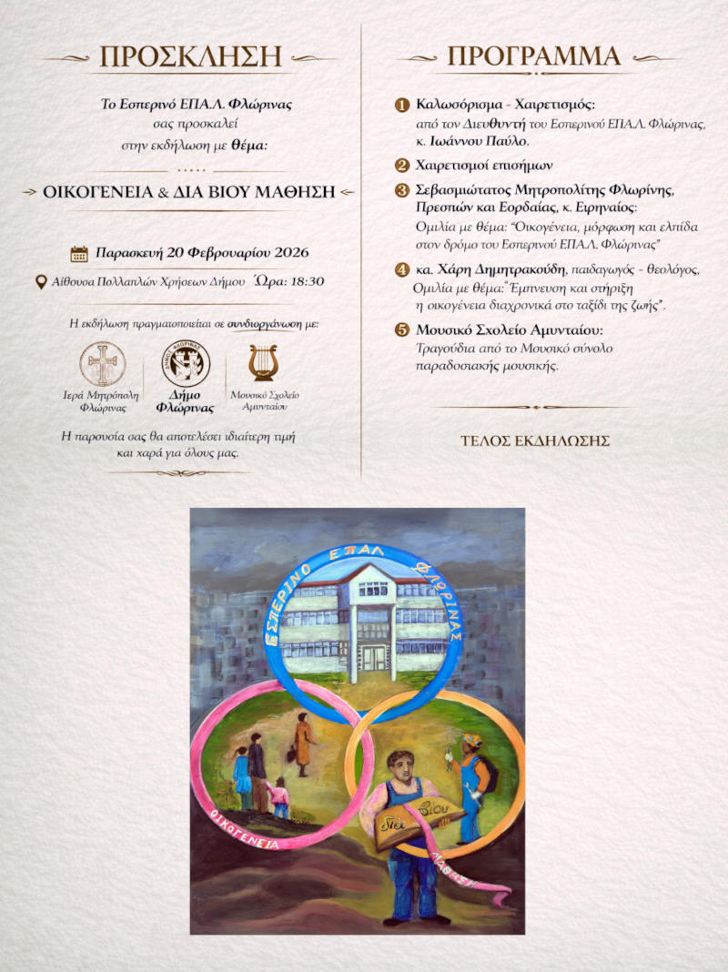 Έτσι, Διευθυντής και ο σύλλογος διδασκόντων του Εσπερινού ΕΠΑΛ Φλώρινας με χαρά σας καλούν στην εκδήλωση με θέμα “οικογένεια και διά βίου μάθηση”, που διοργανώνουν προς τιμή των οικογενειών των μαθητών μας.