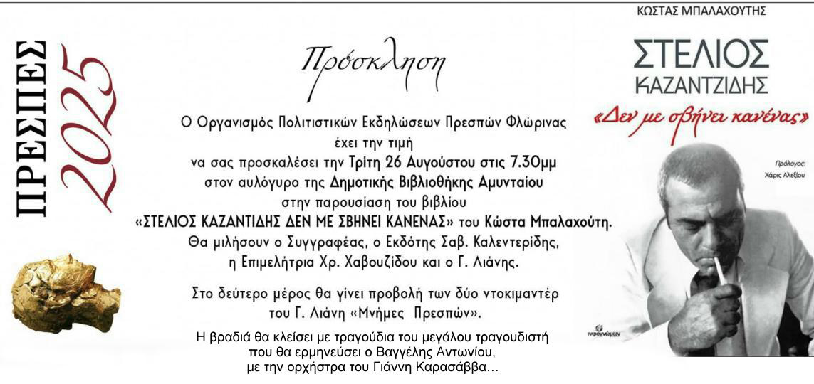ΕκδηλώσειςΠολιτισμόςΕκδήλωση για τον Στέλιο Καζαντζίδη στο Αμύνταιο Τρίτη 26 Αυγούστου, 2025 13:49 florinapress.gr SHARE Ίσως να ενδιαφέρει ... ΕΤΗΣΙΟΣ ΧΟΡΟΣ ΤΟΥ Α.Μ.Σ. “ΒΙΓΛΑ ΠΙΣΟΔΕΡΙΟΥ” Ολοκληρώθηκαν οι θεατρικές παραστάσεις του έργου: “Αλήθεια! Από τί ζει ο άνθρωπος; Μία ώρα αργότερα θα λειτουργήσουν τα σχολεία του Δήμου Αμυνταίου την Tετάρτη 9 Μαρτίου Ευχαριστήριο της Κοινότητας Βαρικού Συλλυπητήριο μήνυμα του Δημάρχου Φλώρινας Share Ακολουθήστε μας8.4kFollowersLikeΤελευταία νέα Αγανακτισμένοι αγρότες : Ως εδώ, η κατάσταση δεν πάει άλλο Κοινωνία Πέμπτη 4 Δεκεμβρίου, 2025 Επισκέψεις Κινητών Μονάδων Υγείας σε απομακρυσμένες Κοινότητες του Δήμου Αμυνταίου Κοινωνία Πέμπτη 4 Δεκεμβρίου, 2025 Ευχαριστήρια επιστολή του Πειραματικού Σχολείου Φλώρινας προς το Κέντρο Περιβαλλοντικής Εκπαίδευσης & Αειφορίας Μελίτης Κοινωνία Πέμπτη 4 Δεκεμβρίου, 2025 Πωλείται Γερμανικός λέβητας ξύλου Κοινωνία Πέμπτη 4 Δεκεμβρίου, 2025