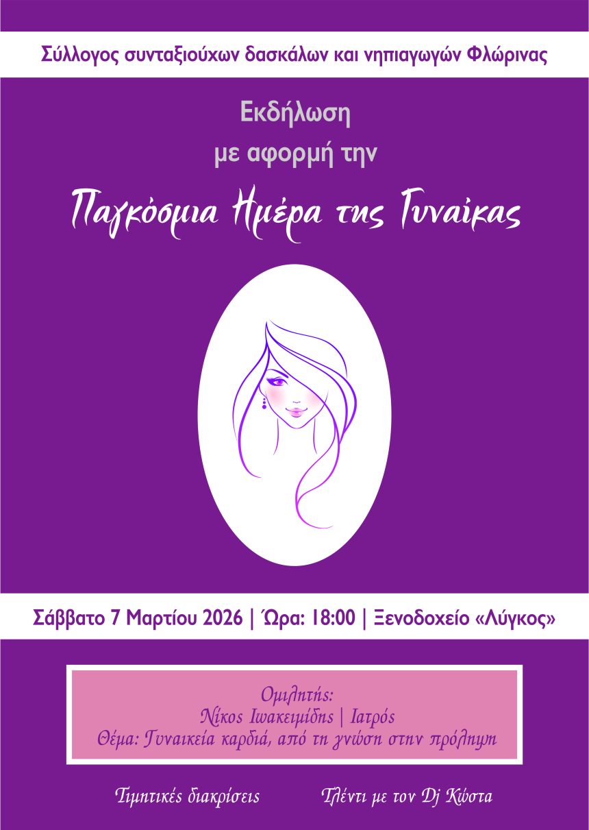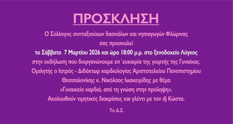 Ο Σύλλογος συνταξιούχων δασκάλων και νηπιαγωγών Φλώρινας σας προσκαλεί το Σάββατο 7 Μαρτίου 2026 και ώρα 18:00 μ.μ. στο ξενοδοχείο Λύγκος στην εκδήλωση που διοργανώνουμε επ΄ευκαιρία της γιορτής της Γυναίκας. Ομιλητής ο Ιατρός – Διδάκτωρ καρδιολογίας Αριστοτελείου Πανεπιστημίου Θεσσαλονίκης κ. Νικόλαος Ιωακειμίδης με θέμα «Γυναικεία καρδιά, από τη γνώση στην πρόληψη». Ακολουθούν τιμητικές διακρίσεις και γλέντι με τον dj Κώστα.