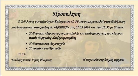 Ο Σύλλογος Συνταξιούχων Καθηγητών & Φίλων σας προσκαλεί στην εκδήλωση που διοργανώνει στο ξενοδοχείο «ΦΑΙΔΩΝ» στις 07.03.2026 και ώρα 18:30 με θέματα: