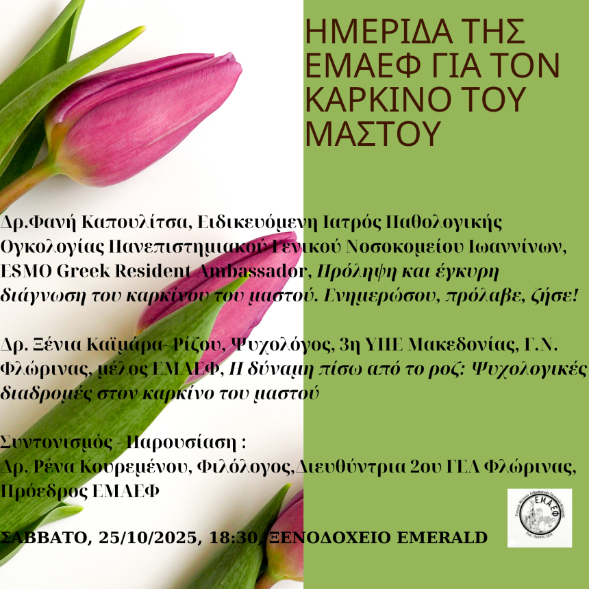 Η Εταιρεία Μελετών Ανθρωπιστικών Επιστημών Φλώρινας (ΕΜΑΕΦ) σας προσκαλεί στην Ημερίδα για τον καρκίνο του μαστού, που θα πραγματοποιηθεί το Σάββατο, 25-10-2025 και ώρα 18:30 στο ξενοδοχείο EMERALD με σκοπό την ενημέρωση  και  ευαισθητοποίηση του κοινού σχετικά με αυτή τη σοβαρή ασθένεια.