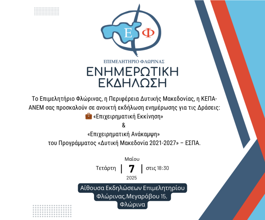 Η Περιφέρεια Δυτικής Μακεδονίας και η Ειδική Υπηρεσία Διαχείρισης του Προγράμματος «Δυτική Μακεδονία 2021-2027», σε συνεργασία με την ΚΕΠΑ-ΑΝΕΜ ΑΜΚΕ (αρμόδιο Εταίρο – Περιφερειακή Μονάδα του Ενδιάμεσου Φορέα ΕΦΕΠΑΕ) και το Επιμελητήριο Φλώρινας, σας προσκαλούν σε ανοιχτή ενημερωτική εκδήλωση με θέμα:
