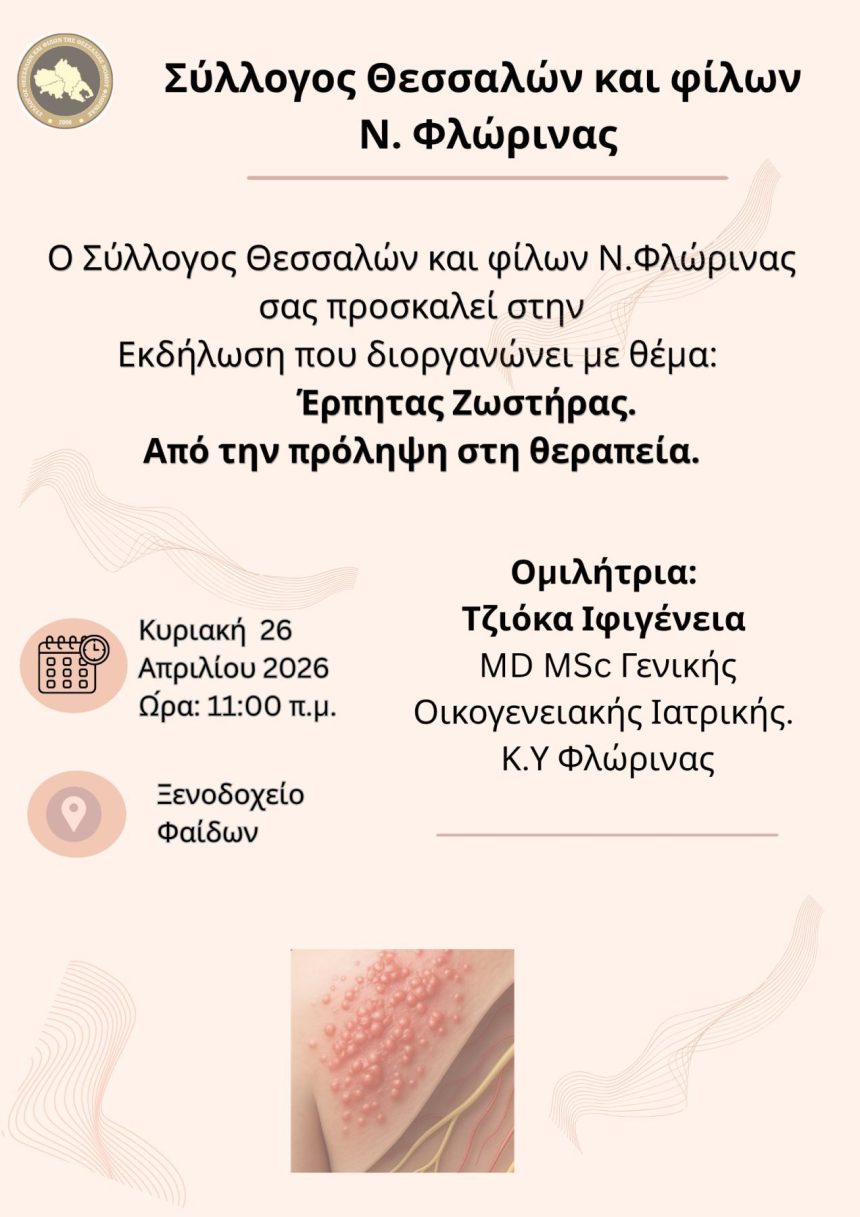 Το Δ.Σ. του  Συλλόγου Θεσσαλών και φίλων Ν. Φλώρινας σας προσκαλεί σε ενημερωτική εκδήλωση με θέμα τον Έρπητα Ζωστήρα, την Κυριακή 26 Απριλίου στις 11:00 π.μ. στο Ξενοδοχείο Φαίδων.