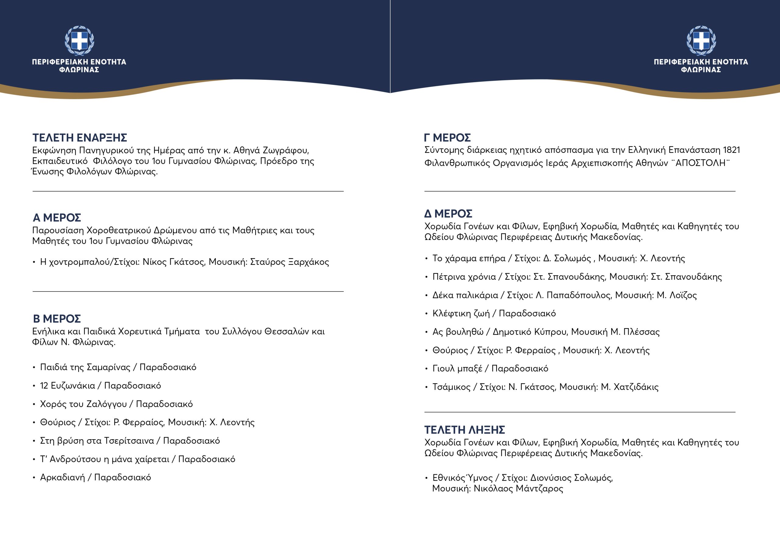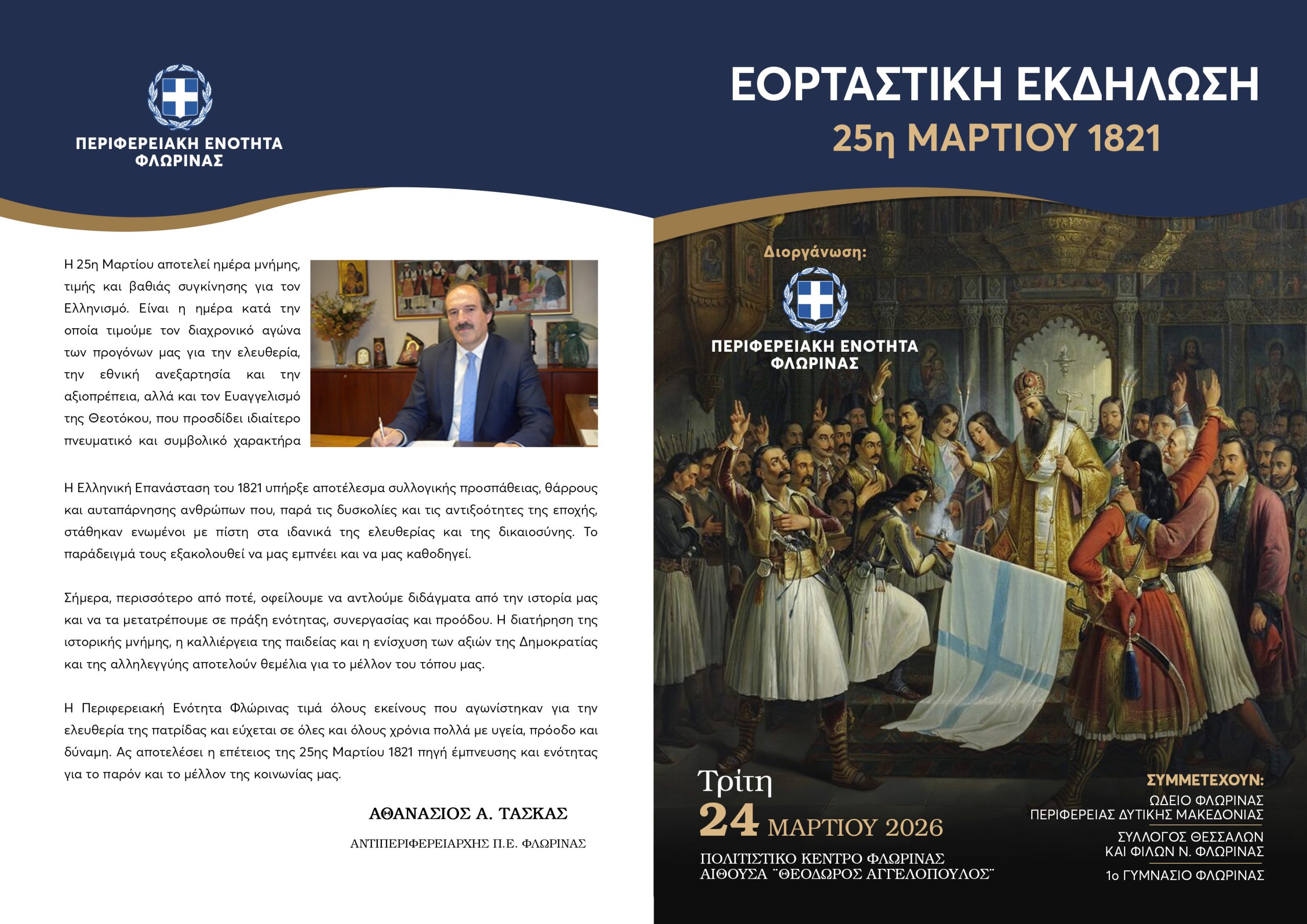 Η Περιφερειακή Ενότητα Φλώρινας σας προσκαλεί στην Επετειακή Εκδήλωση για τον εορτασμό της Εθνικής Επετείου της 25ης Μαρτίου 1821, η οποία θα πραγματοποιηθεί την Τρίτη 24 Μαρτίου 2026 και ώρα 19:00, στο Πολιτιστικό Κέντρο Φλώρινας, Αίθουσα «Θεόδωρος Αγγελόπουλος».