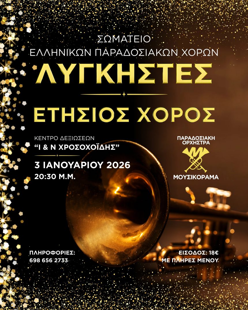 Το Σωματείο Ελληνικών Παραδοσιακών Χορών «ΛΥΓΚΗΣΤΕΣ» σας προσκαλεί στον ετήσιο χορό του, το Σάββατο 3 Ιανουαρίου 2026, στο κέντρο Ι.Ν. Χρυσοχοΐδης, με ώρα έναρξης 20:30μμ. .