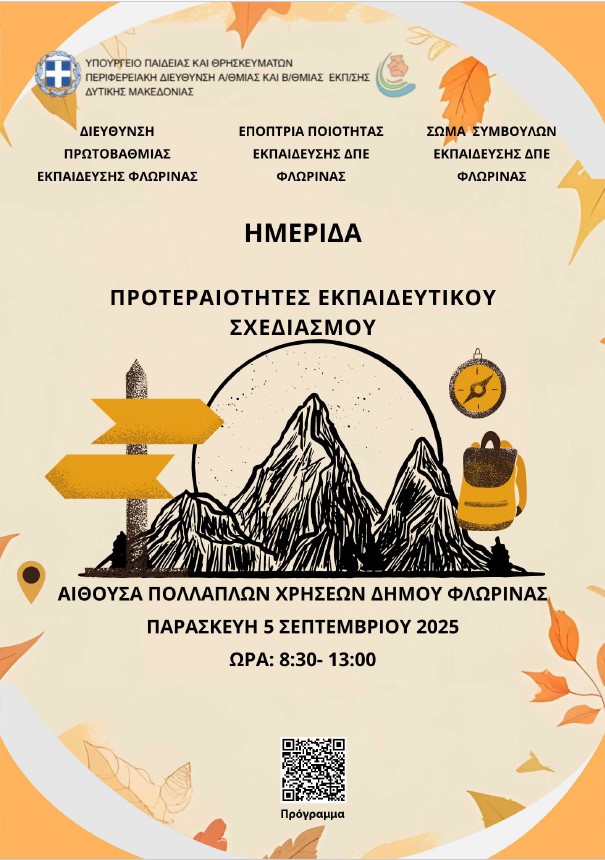 «ΠΡΟΤΕΡΑΙΟΤΗΤΕΣ ΕΚΠΑΙΔΕΥΤΙΚΟΥ ΣΧΕΔΙΑΣΜΟΥ» Φλώρινα, 5 Σεπτεμβρίου 2025 Αίθουσα Πολλαπλών Χρήσεων Δήμου Φλώρινας 8.30΄- 13.00΄ | |
